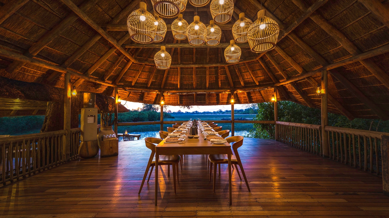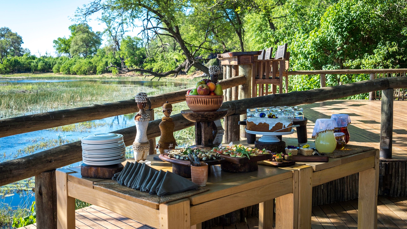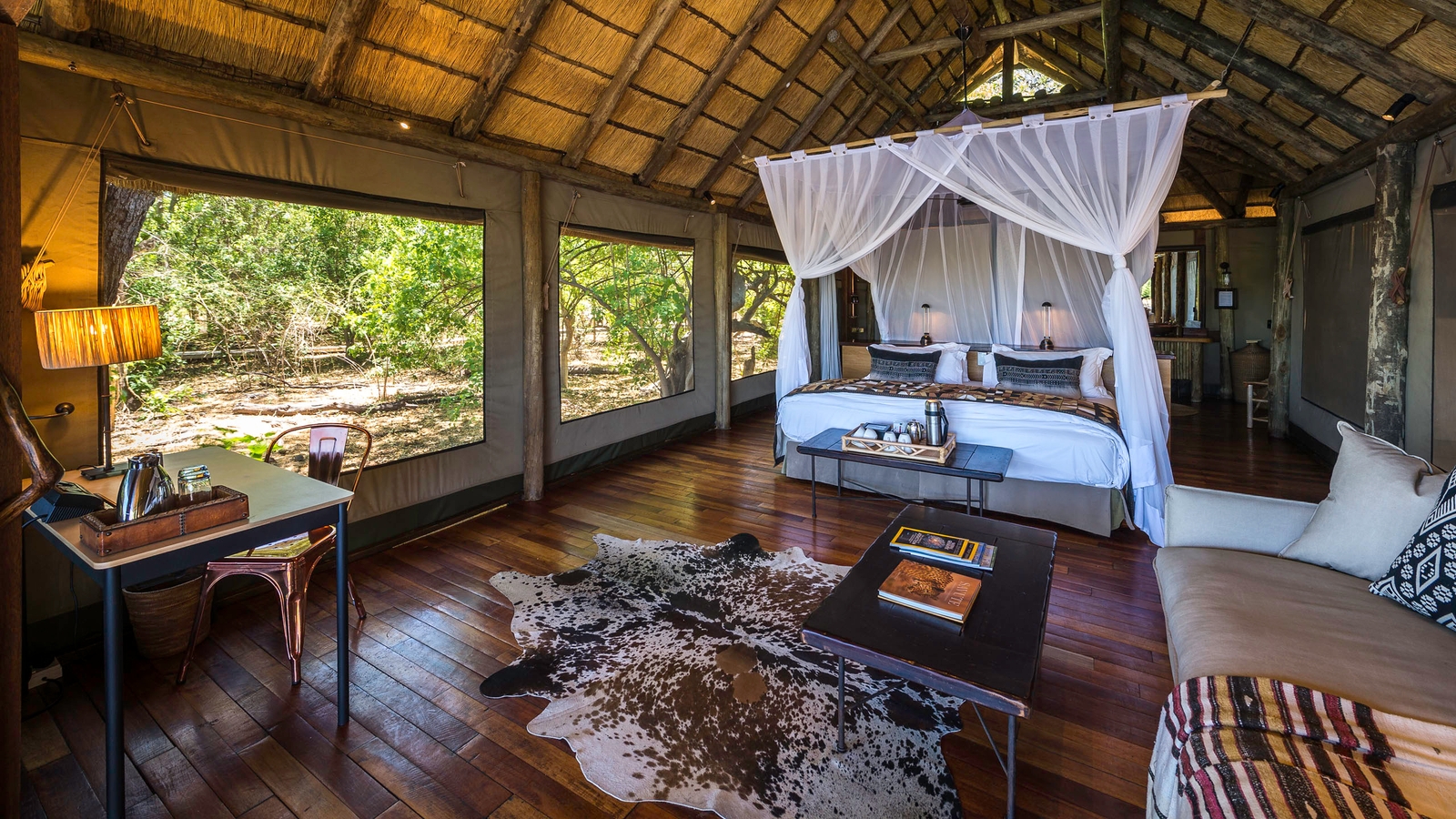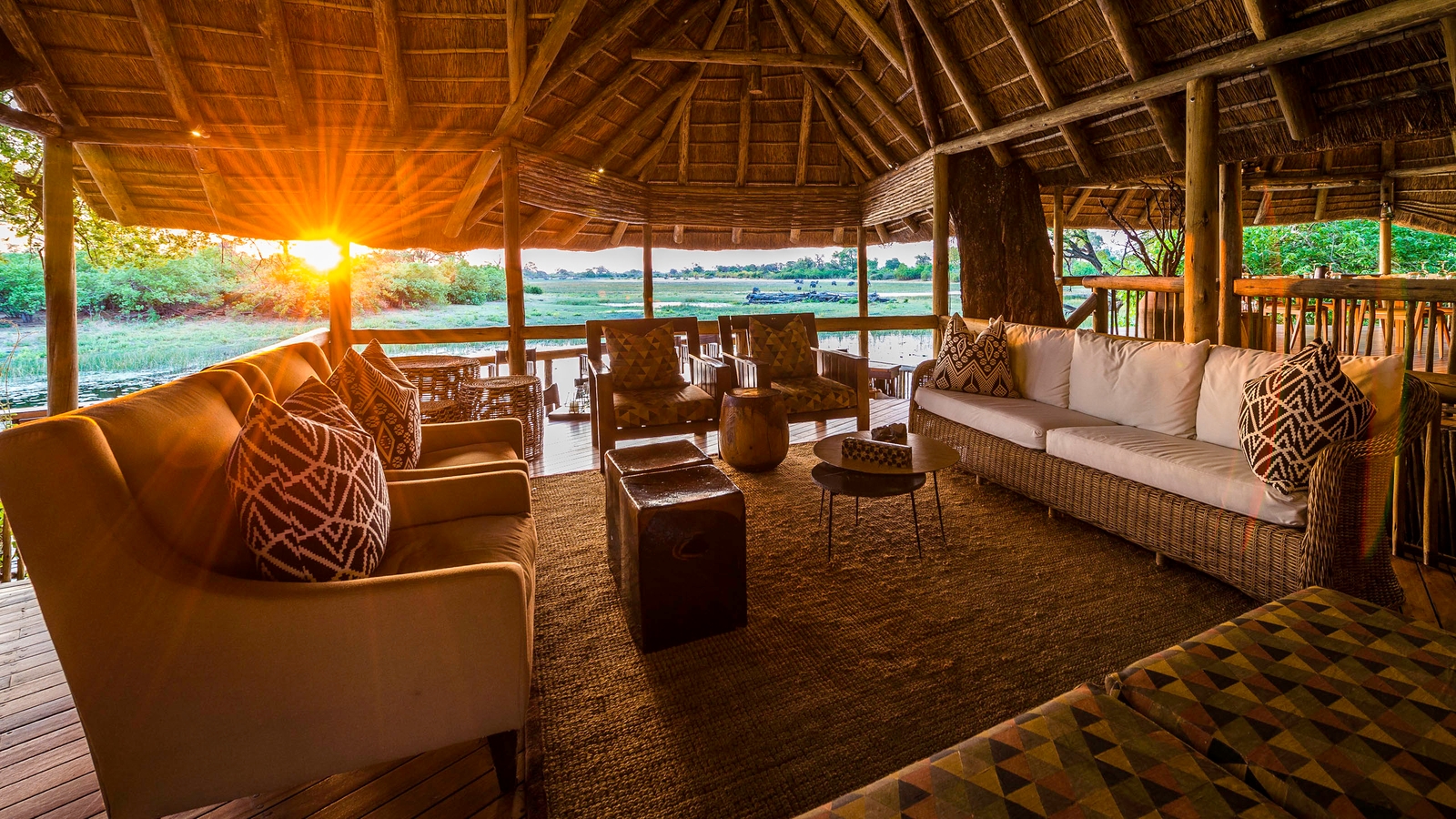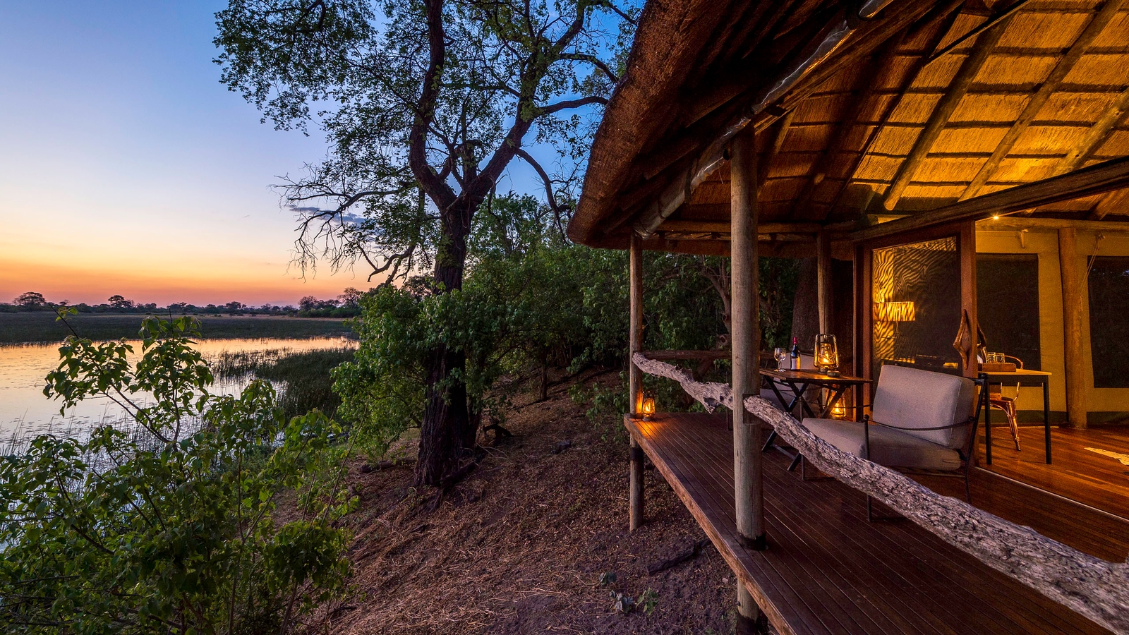 There are just seven large tents at this intimate camp, including a family unit that is raised off the ground. Outside the thatched dining area, a small pool and large viewing area with fire pit extend outwards on raised wooden decks, providing a wonderful view over the channel and its prolific wildlife.