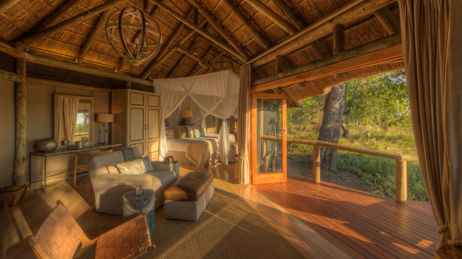 In between game drives, guests can relax around the sunken bar, built around a large termite mound and ebony tree, or in the expansive lounge area which leads towards a library and the decking. These areas, as well as the elevated dining area, are connected by boardwalk to the fireplace in front of the camp. The camp also features an open air boma and swimming pool.