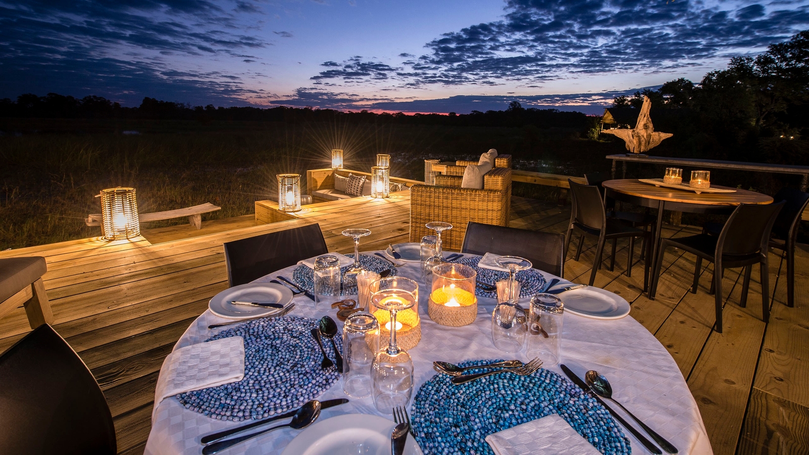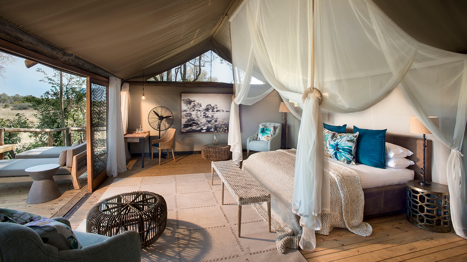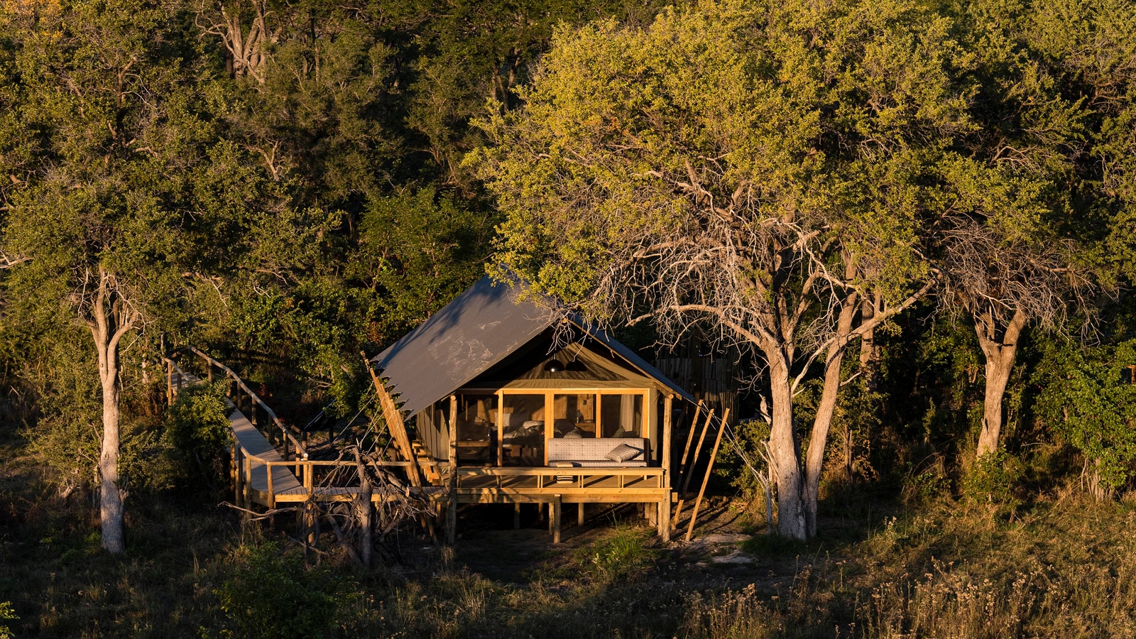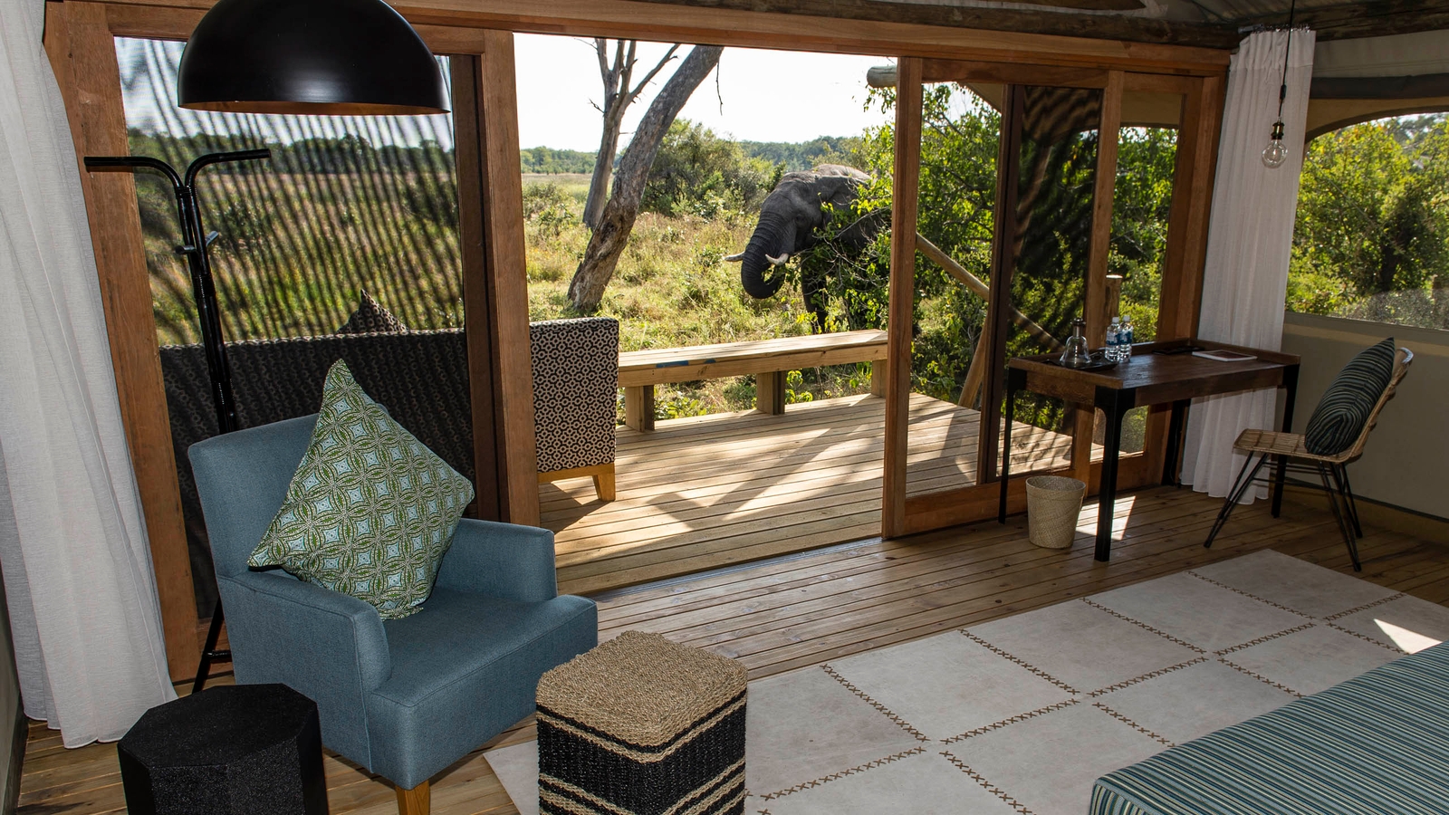 The camp itself has 12 luxury safari tents elevated on decks to give you a view of the lagoon, each with en suite bathrooms, indoor and outdoor showers and a veranda. You can watch passing herds of plains game, elephant and buffalo coming to drink from the camp’s swimming pool, lounge and bar.