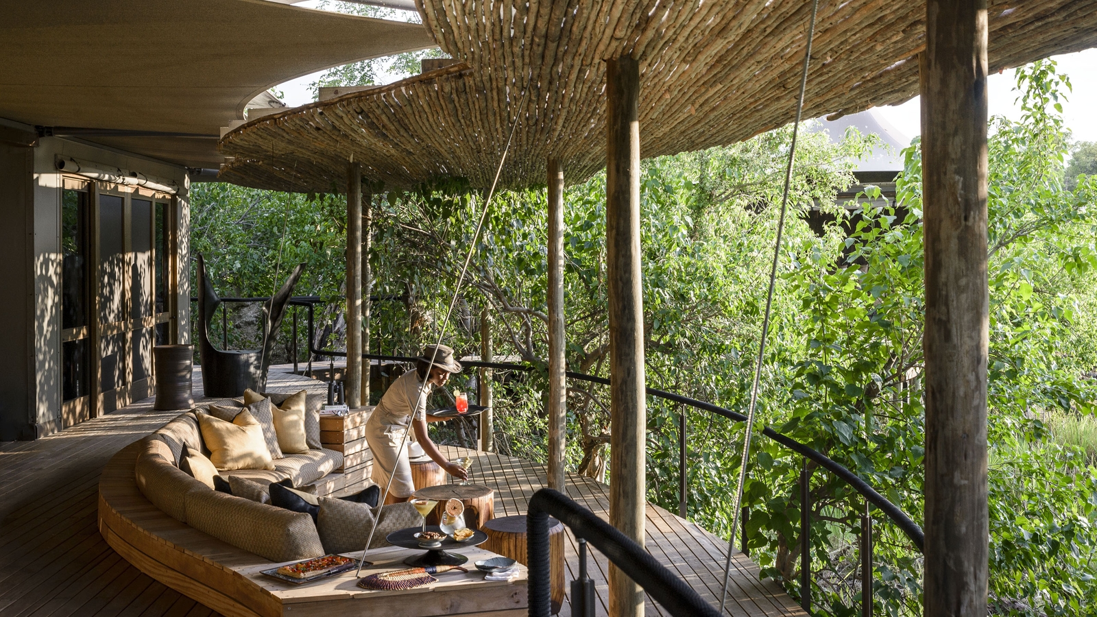 Ten simple, standalone, and sublimely comfortable stilted tent rooms are shrouded in the riverine forest, and its main areas are typically and tastefully African: thatch roofs, wooden floors and furniture, warm lantern light, bonfire, a traditional boma and a plunge pool to cool off in.