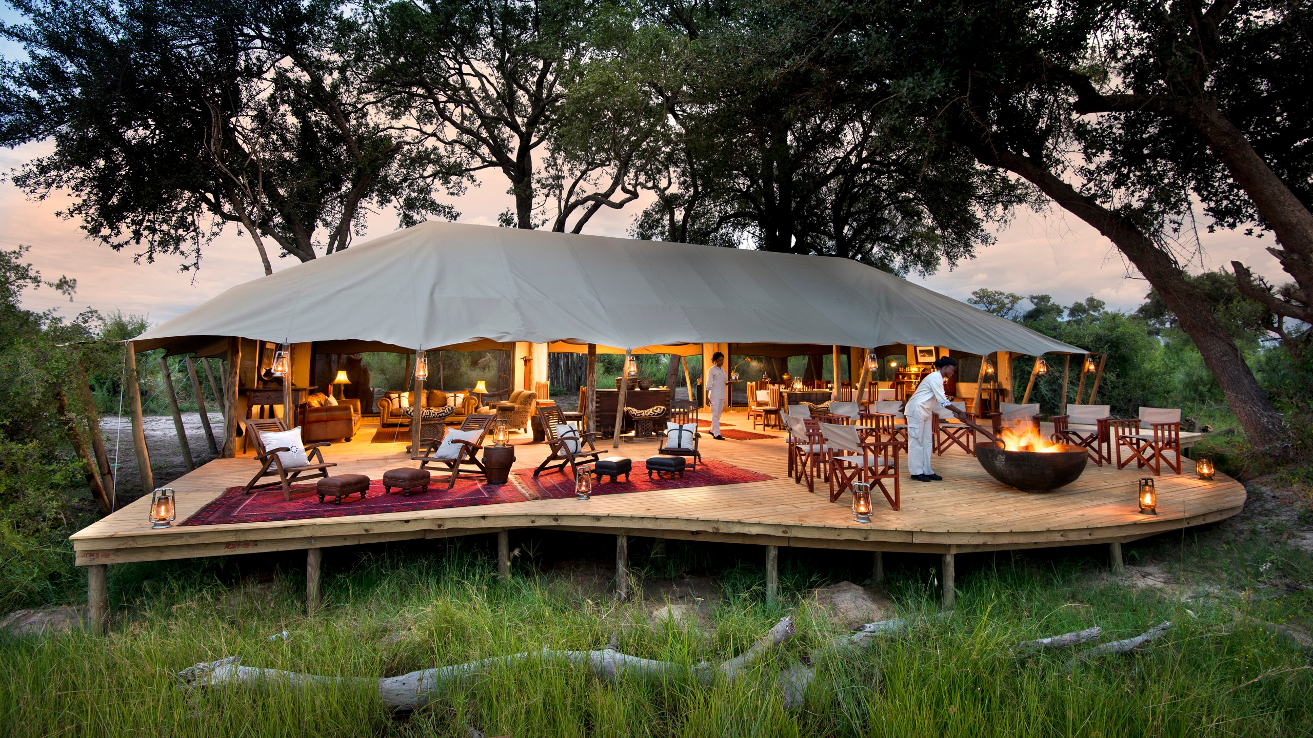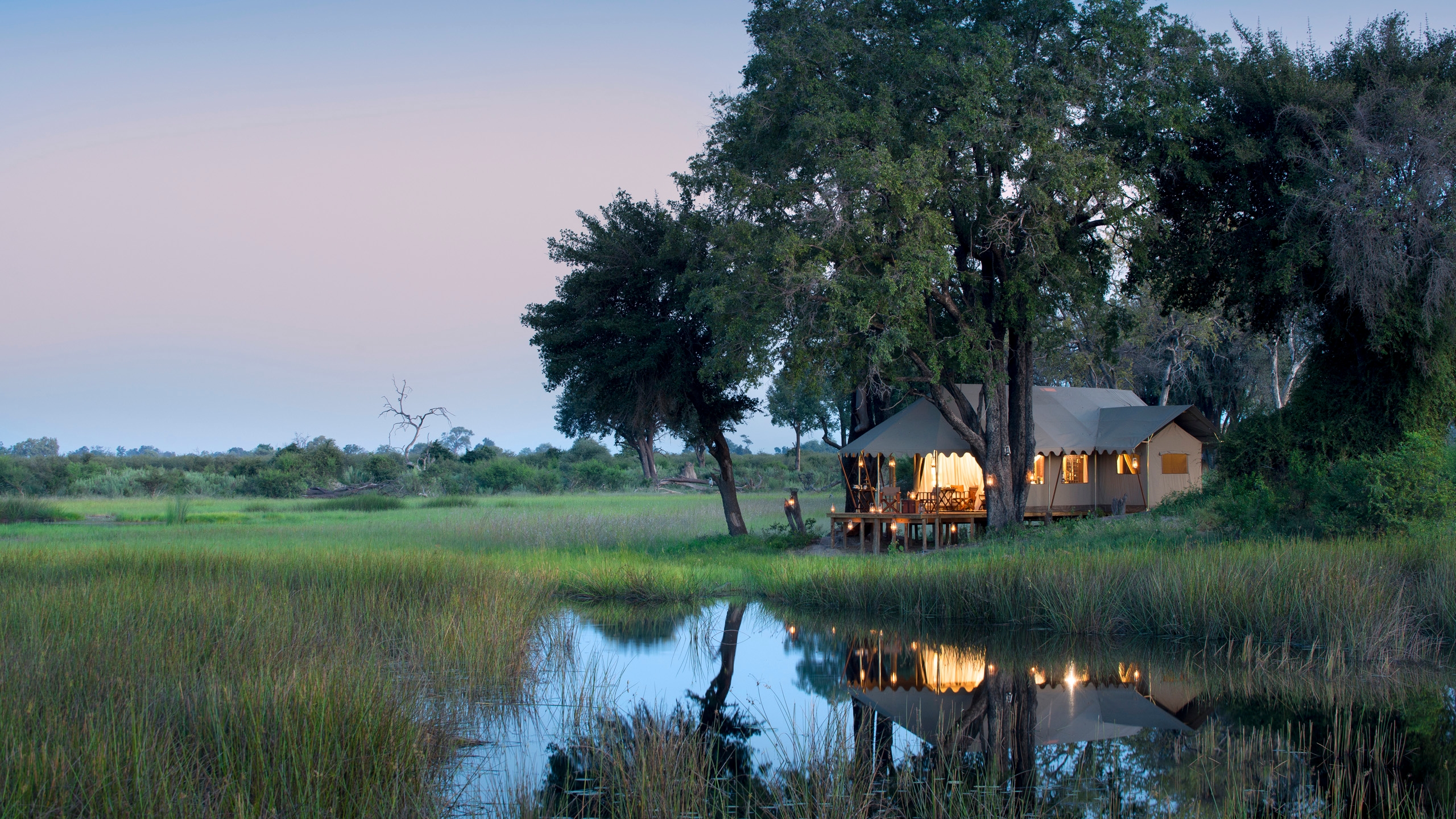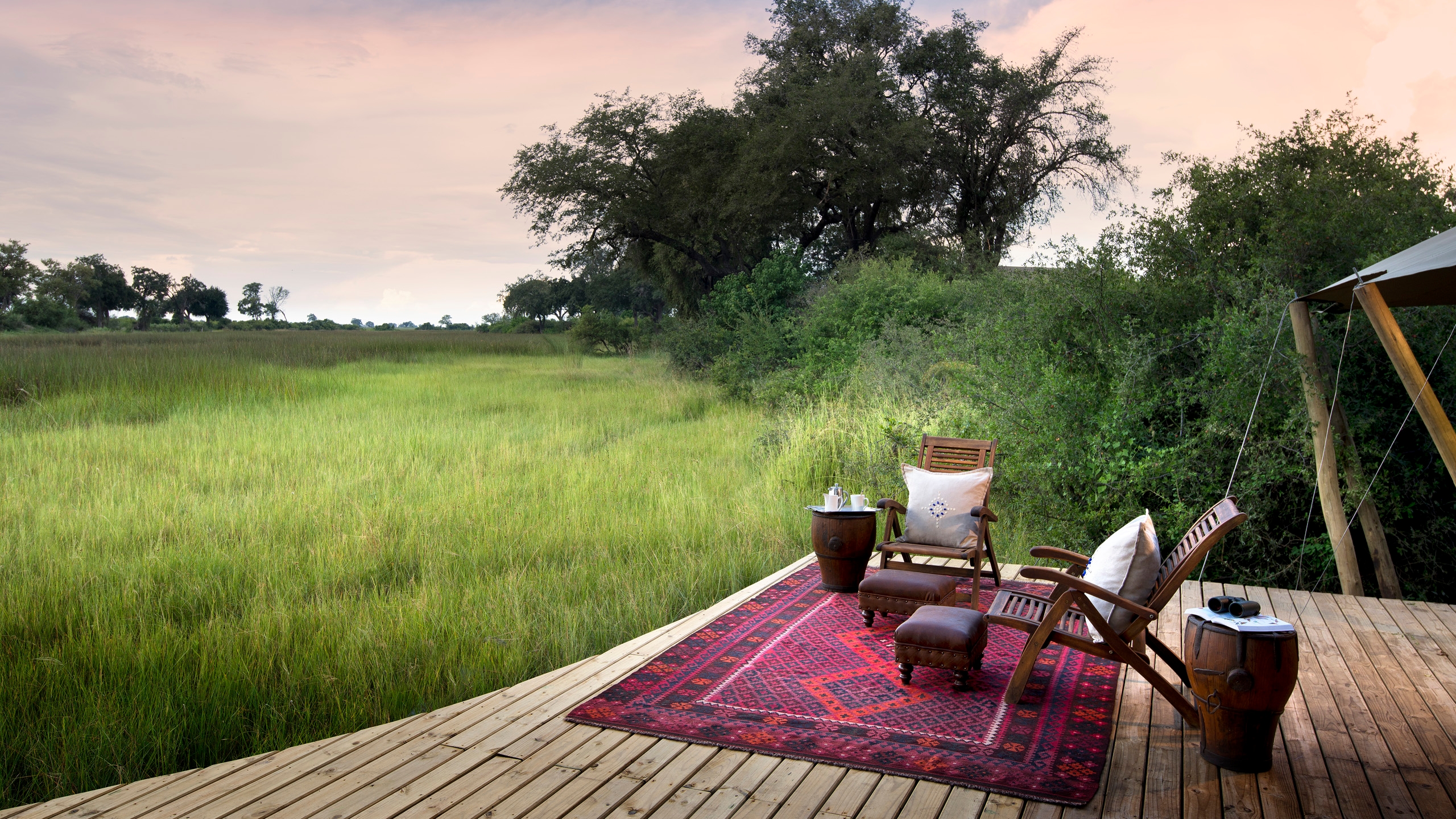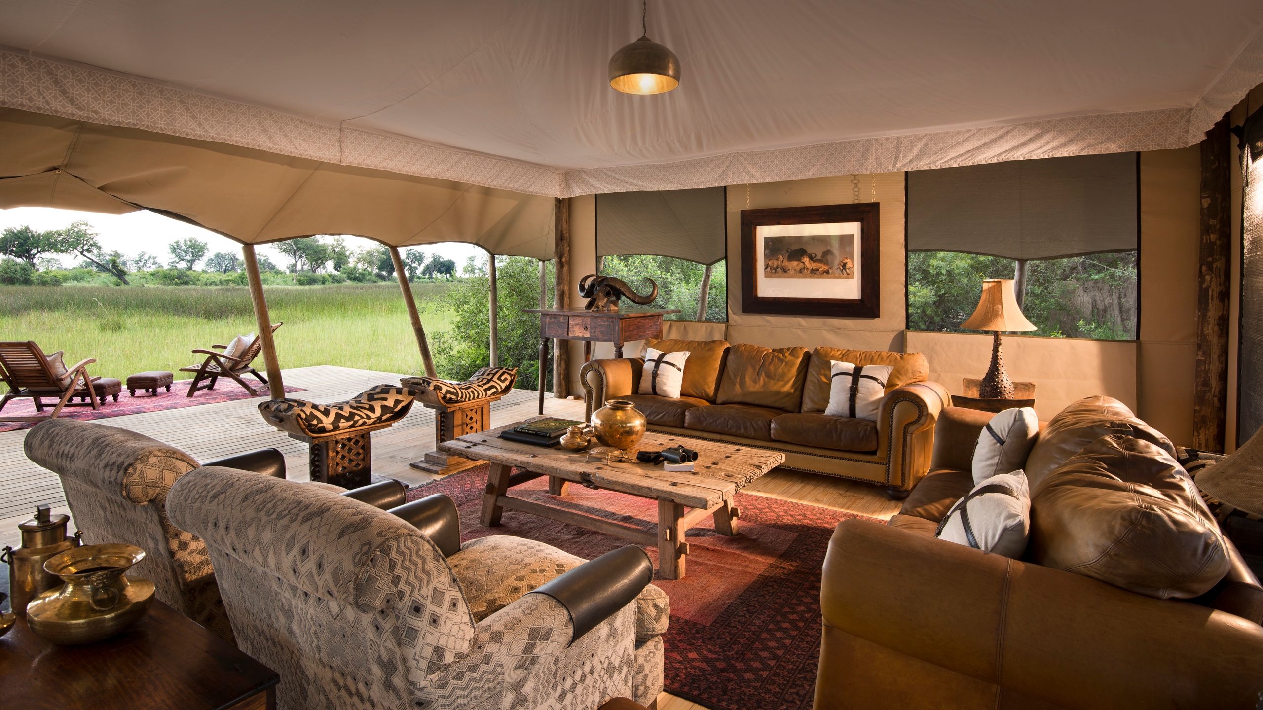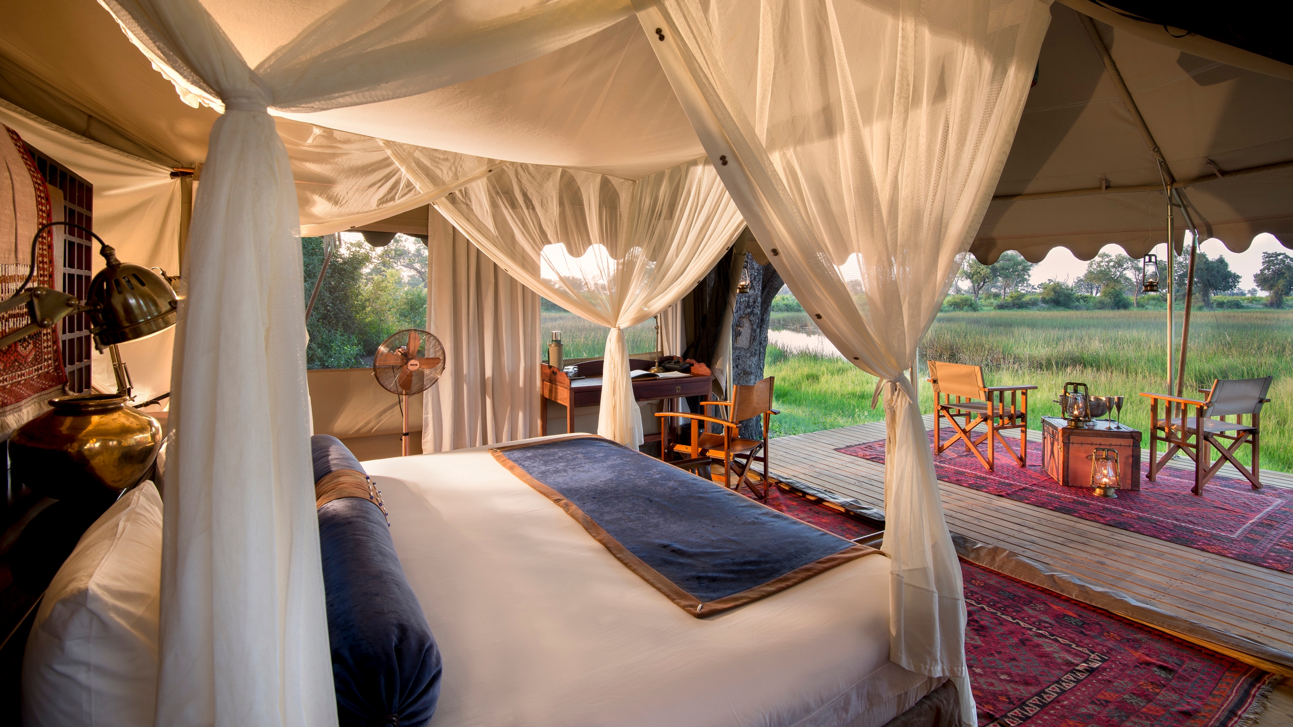 The camp is built on a wooded island and consists of six expedition-style tents that sit on slightly raised decking and look out across the surrounding floodplains. With wooden writing desks and large four-poster beds, the tents are designed to evoke feelings of old-school safari xploration. There are en-suite bathroom and an open-plan living and dining area, which opens on all sides, leads out onto a private verandah.