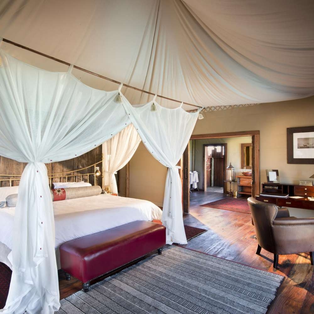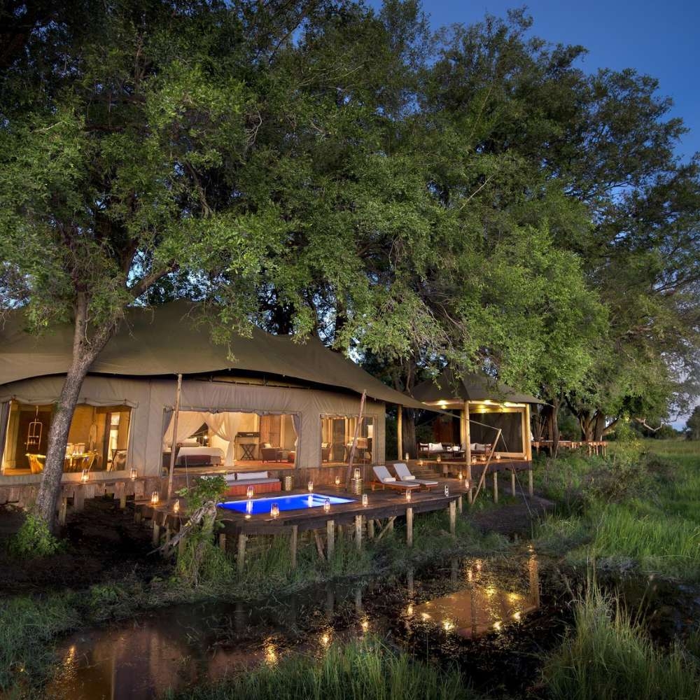Simply one of the most beautiful tented camps in Africa, Zarafa is a triumph of conservation and attention to detail. There are just 4 immense tented suites set on raised wooden platforms overlooking the floodplain of the Zibadianja Lagoon. The tents are decorated in a style befitting of the explorations of the early 20th Century, matched with modern comforts and technological surprises. Outdoor decking wraps around each guest suite and offers guests a private plunge pool, private outdoor shower, and outdoor seating.