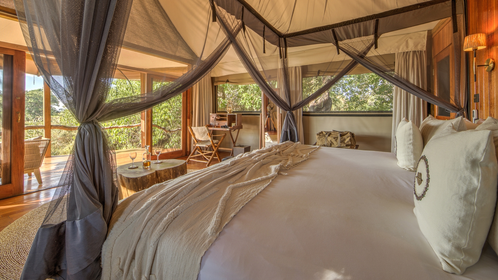 The camp consists of seven luxury tents and one family tent, all with en suite bathrooms. The spacious tents offer enough privacy while being just a short distance from the main camp where you’ll find a comfortable lounge area that looks out over the beautiful surroundings. There is also a sleep-out deck that offers guests the opportunity to spend a night under the star-studded African sky.