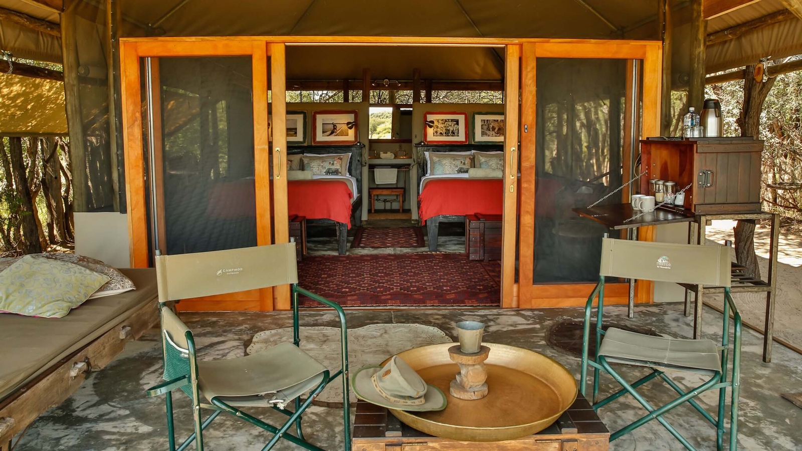 Meno a Kwena boasts nine classical and comfortable canvas tents, all with en suite bathrooms, with verandahs overlooking the river which draws elephant and zebra from far around with some of the best game viewing right in front of the camp itself.
