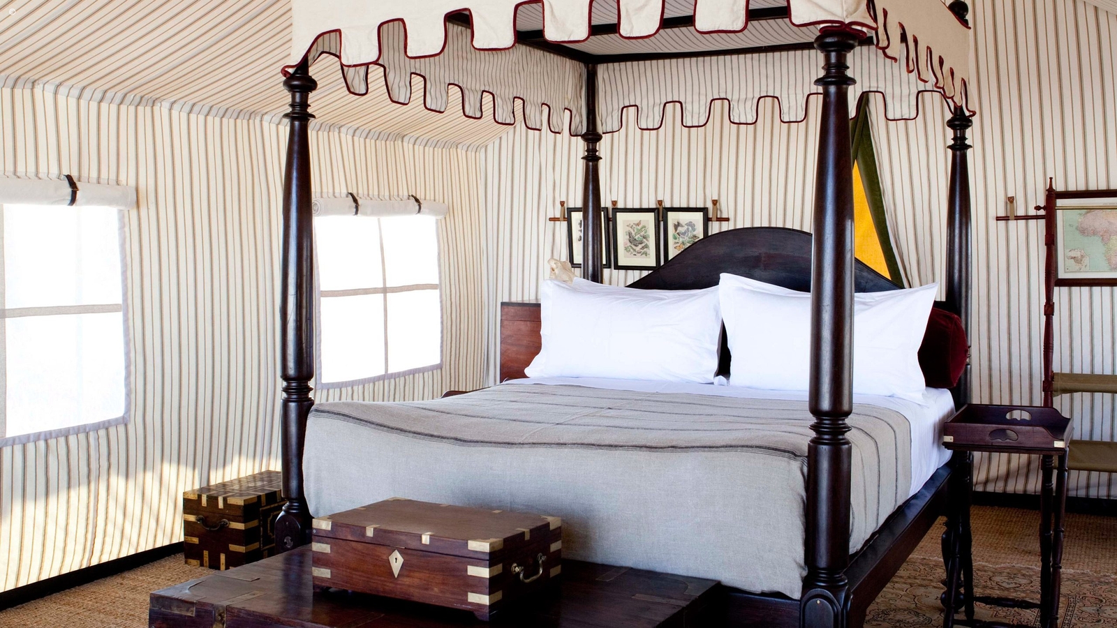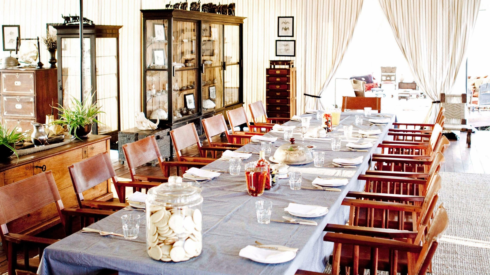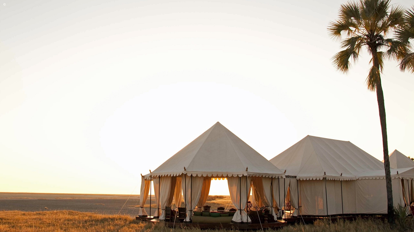 The camp itself mirrors the simplicity and open spaces of the pans. Six elegant spacious pavilion style tents sit each under a cluster of tall palms. Period style pieces adorn the interiors with lovely wooden chests, boxes and brass fittings about. Bathrooms are equipped with bucket showers and a flush toilet. The rooms are lit by the warm glow of old-fashioned spirit lamps.
