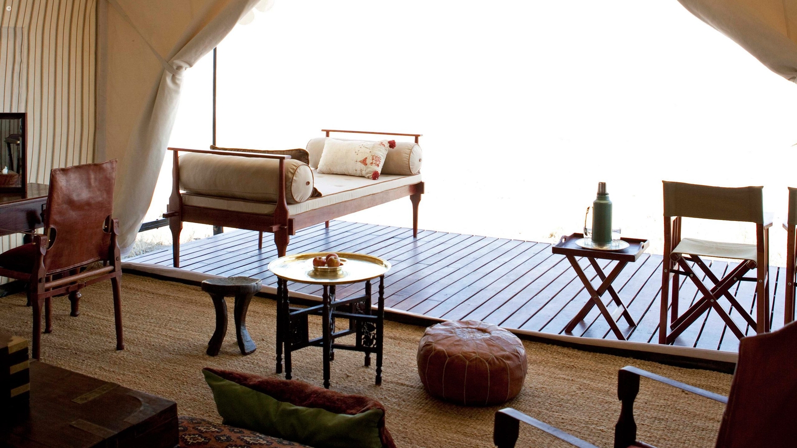 The camp itself mirrors the simplicity and open spaces of the pans. Six elegant spacious pavilion style tents sit each under a cluster of tall palms. Period style pieces adorn the interiors with lovely wooden chests, boxes and brass fittings about. Bathrooms are equipped with bucket showers and a flush toilet. The rooms are lit by the warm glow of old-fashioned spirit lamps.