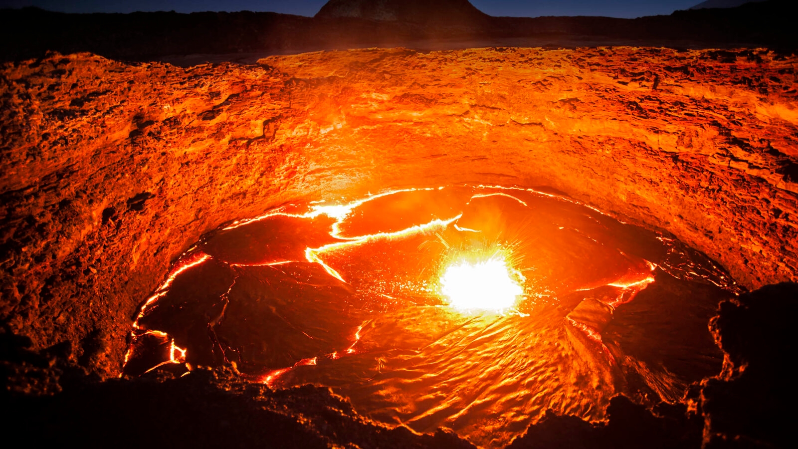 It’s a vast Venusian landscape of salt pans, sulphuric springs, sun-baked mountains, endless desert and hyper-saline lakes into which the mighty Awash River spills. This extraordinary place is also home to one of the world’s six persistent lava lakes, the broiling Erta Ale.