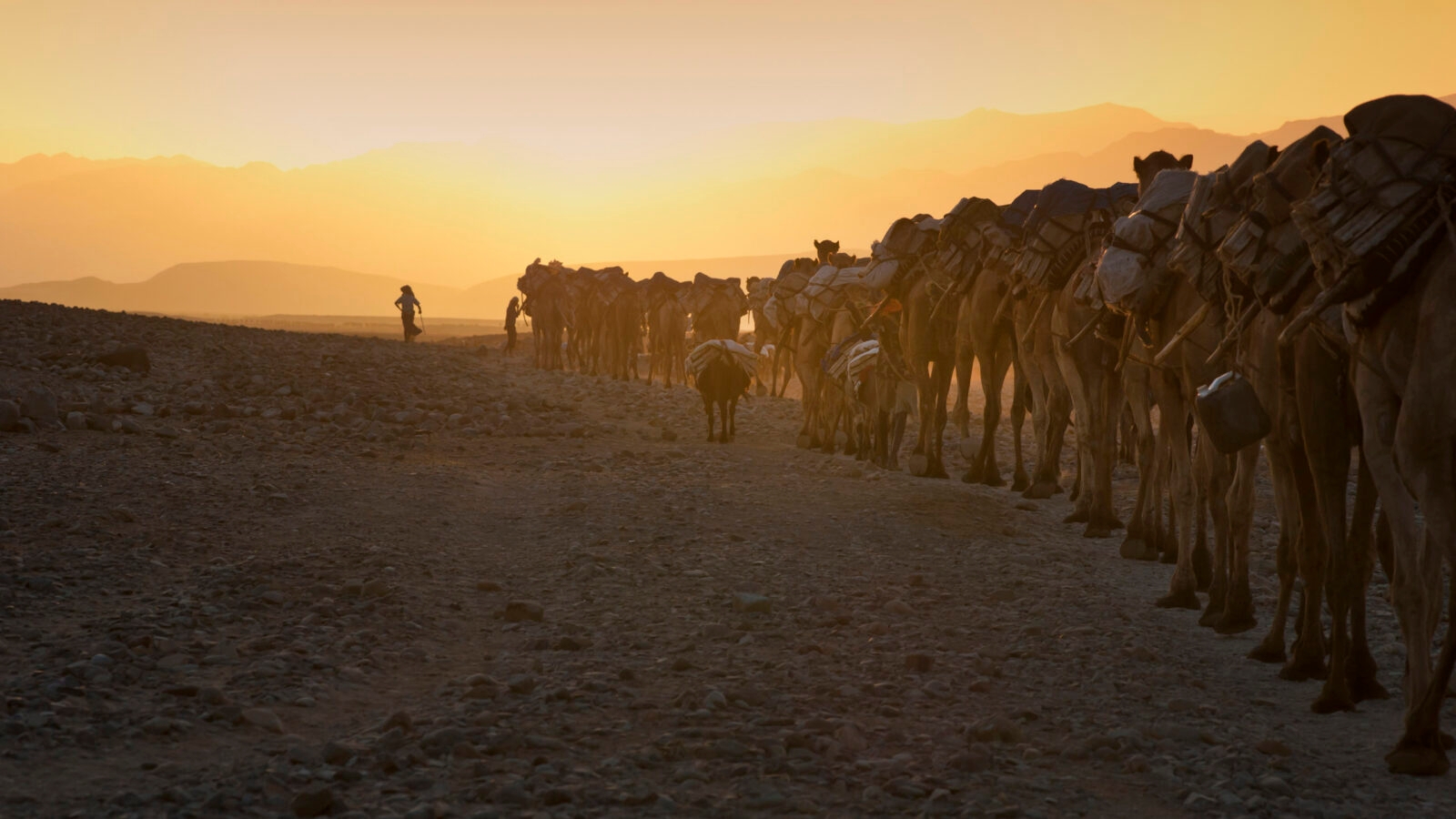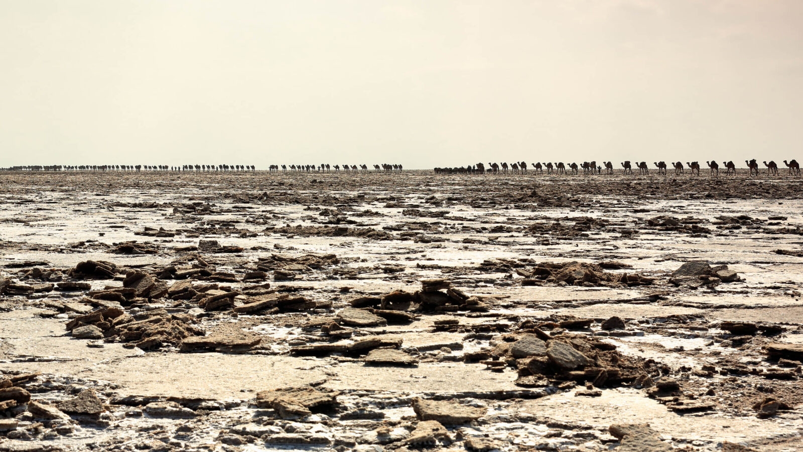 Despite its inhospitable nature (so much so that astrobiologists work here to help understand how life may arise on other planets), the hardy Afar people lead snaking camel trains through the heat haze, carrying hand cut slabs of salt to market at Mekele. Living nomadically, they survive off an incredibly small amount of water and simple bread on week-long treks across the desert.
