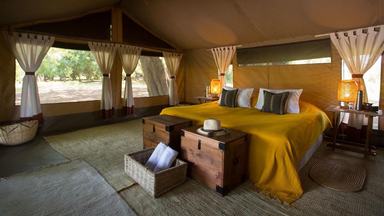 The canvas camp includes a mess tent and a maximum of seven sleeping tents. The accommodation is simple, but comfortable, with sturdy walls and floors. Each tent has a veranda and en-suite facilities with hot water and flushing toilets. Natural wood and woven rugs add a warm touch to the tents, along with bold earthy colours and luxurious fabrics.