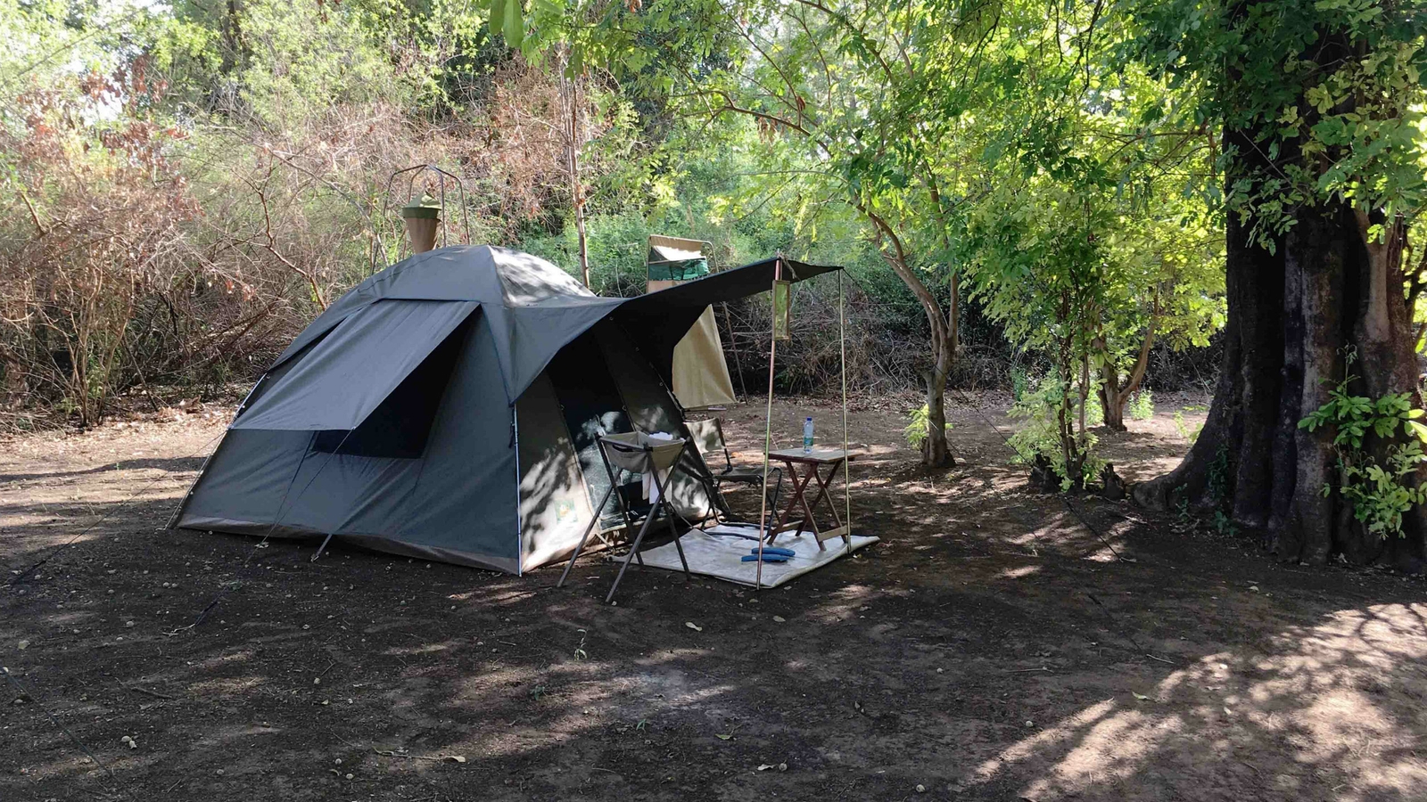 Dome tents scattered across the red earth, amongst the trees, encircle a communal dining area. Each tent can accommodate two people on single cots, with soft mattresses, and in front of the tents, there’s a table and chairs, ideal for sipping on coffee in the cool of the morning and nursing a G&T as the sun sets. There’s also a mirror and simple canvas basin, which can be filled with hot water, a bucket shower in a separate cubical, as well as a long-drop toilet.