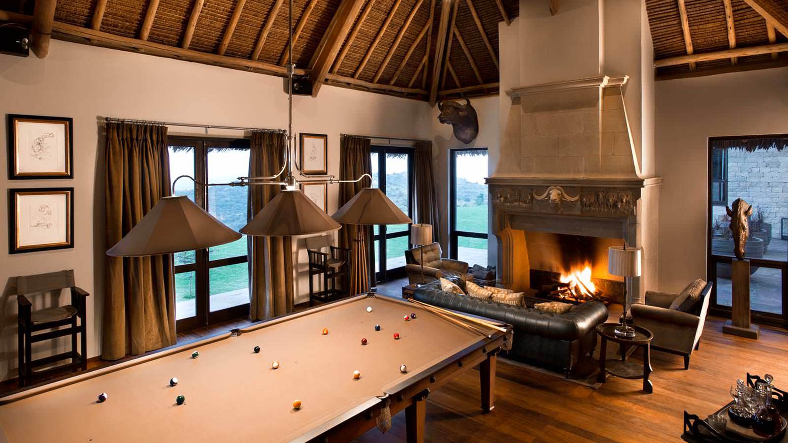 And then there are the suites. Six extravagant rooms feature African art and sitting rooms that lead onto gorgeous verandas. Though, the master suite is the house’s showstopper with its own study, dressing room, sitting area, private terrace, pool and huge, classical marble bath where you can watch the animals graze below.