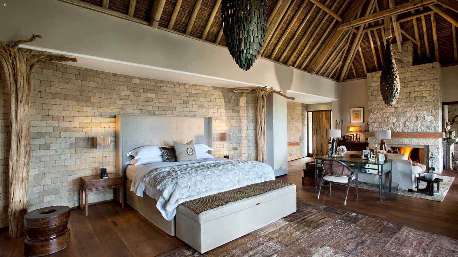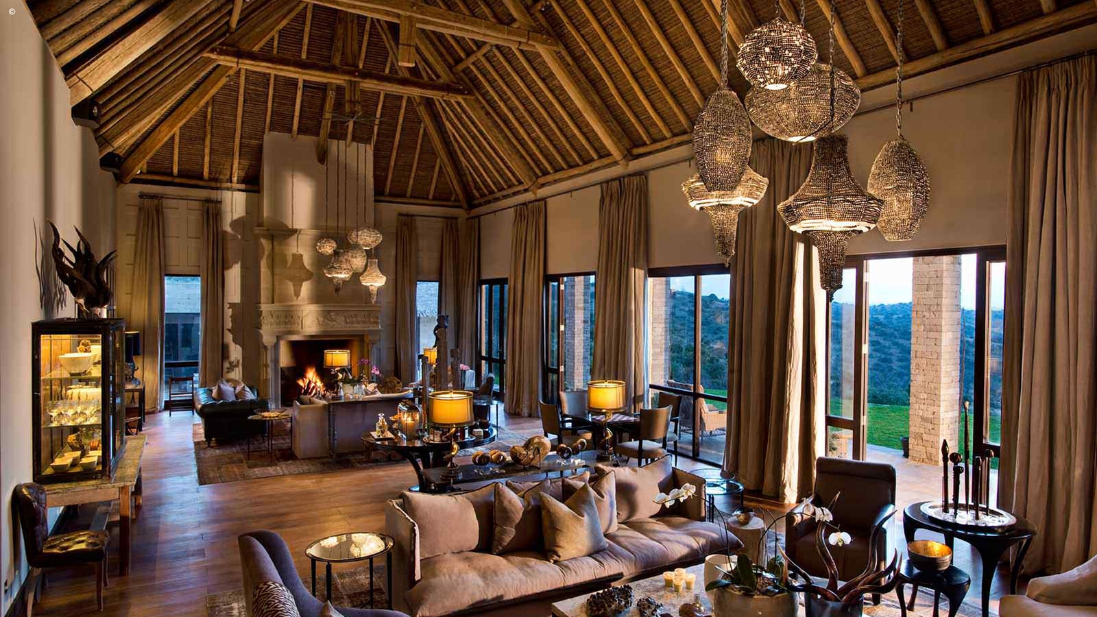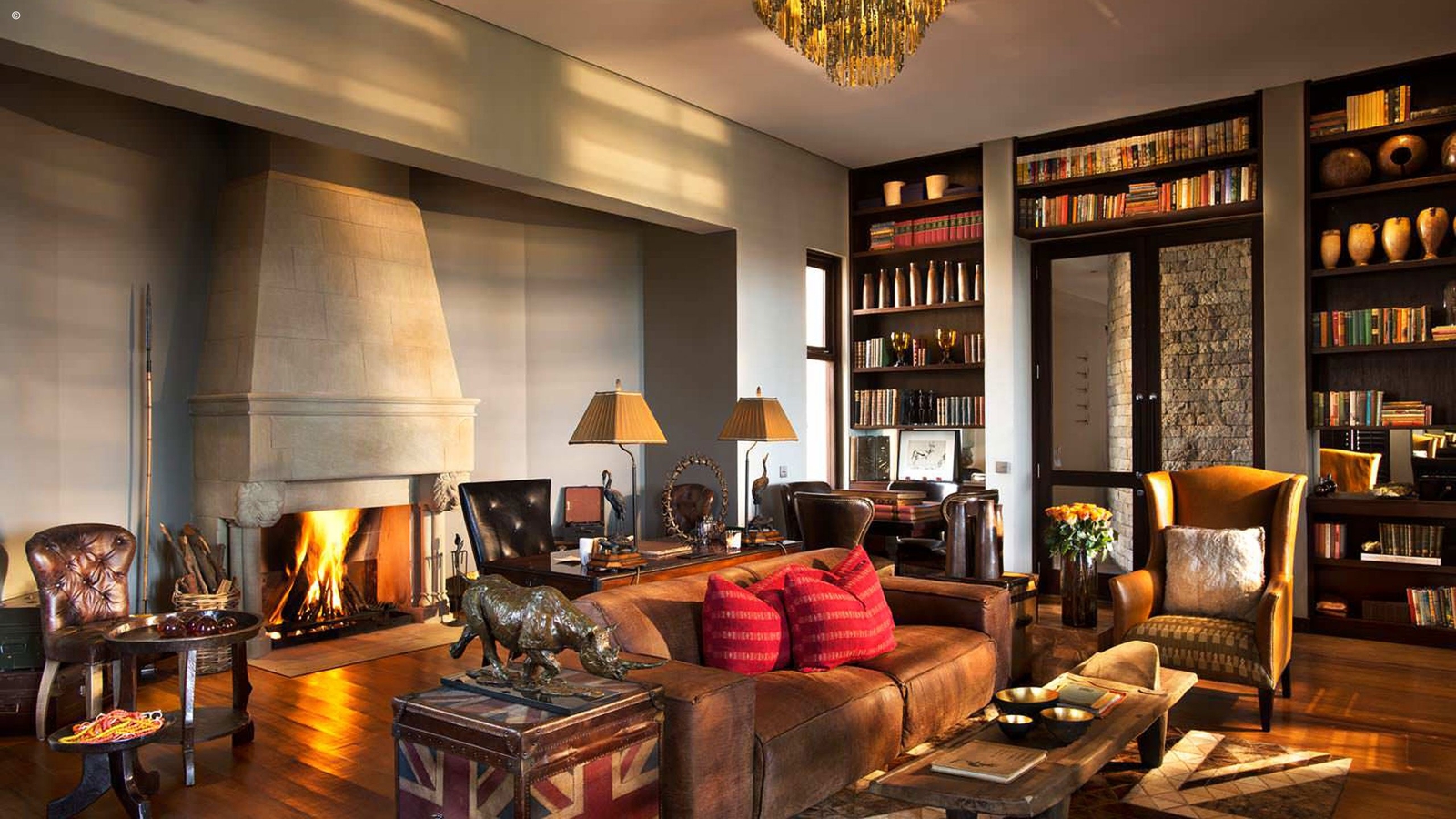 The attention to detail is remarkable. From the high ceilings and giant carved sandstone fireplaces in the drawing room, to the dining room’s epic chandelier, to gardens filled with a pool, boma and relaxing areas, every imaginable luxury is here.