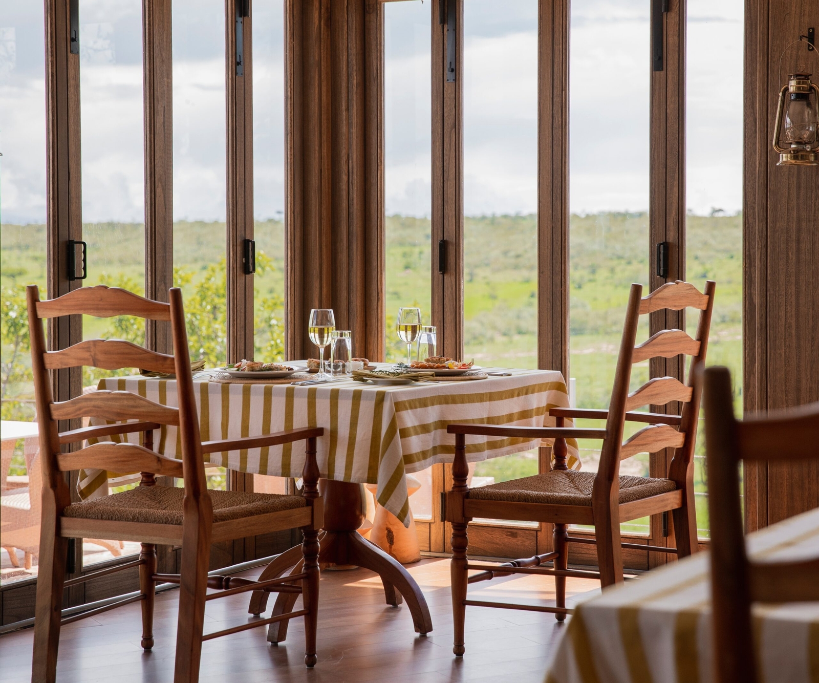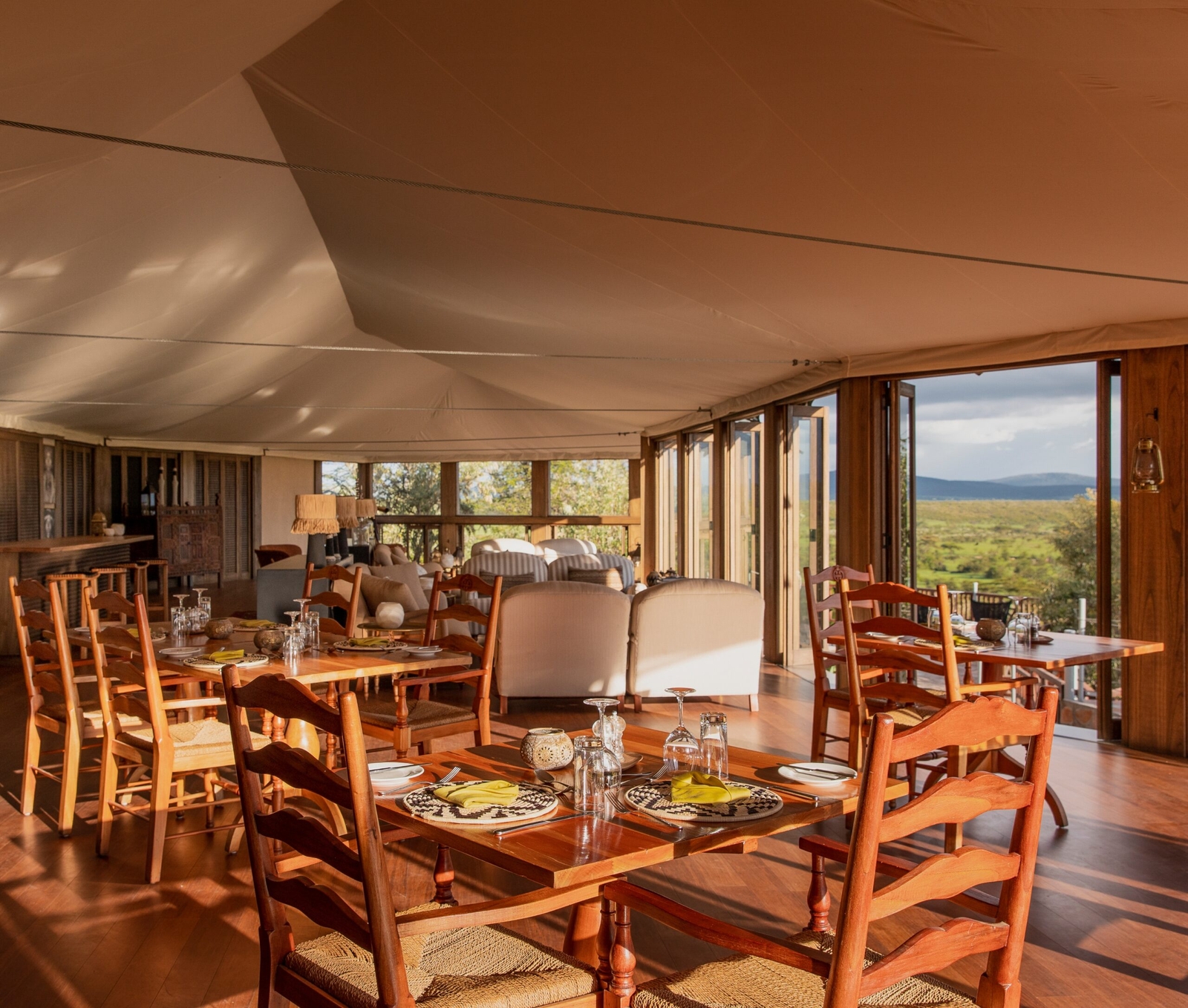 With a view of the acacia scrub behind your table, the dining area will reinvigorate your senses, whether you sit inside the modern establishment or on the outside terrace. Dining can be enjoyed in a multitude of ways: with a completely mobile kitchen, meals can be had on the grassy plain of the conservancy one evening, or eaten by lantern light as you gaze across the Ngama Hills the next. Private dining on the decks is also available.