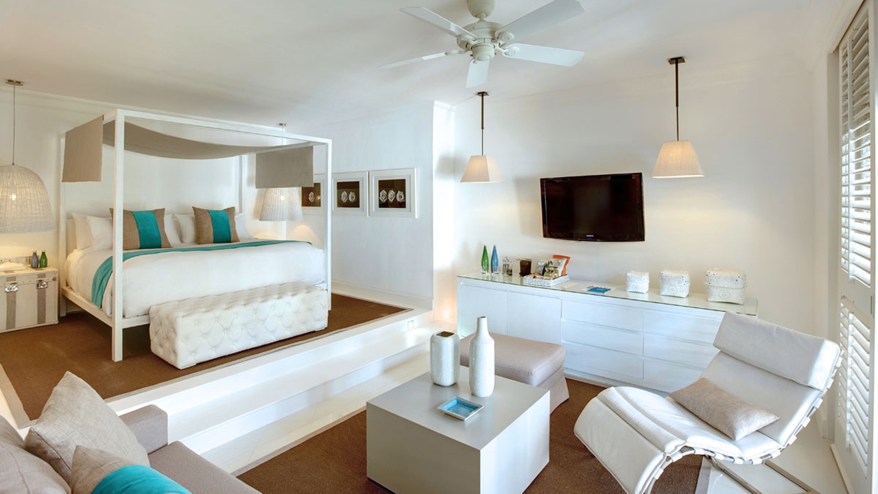 The 186 rooms were designed by Kelly Hoppen. There are a variety of suites and villas to choose from, with ocean, garden, beach or pool views. Interiors are contemporary and uncluttered, with bright colour accents.