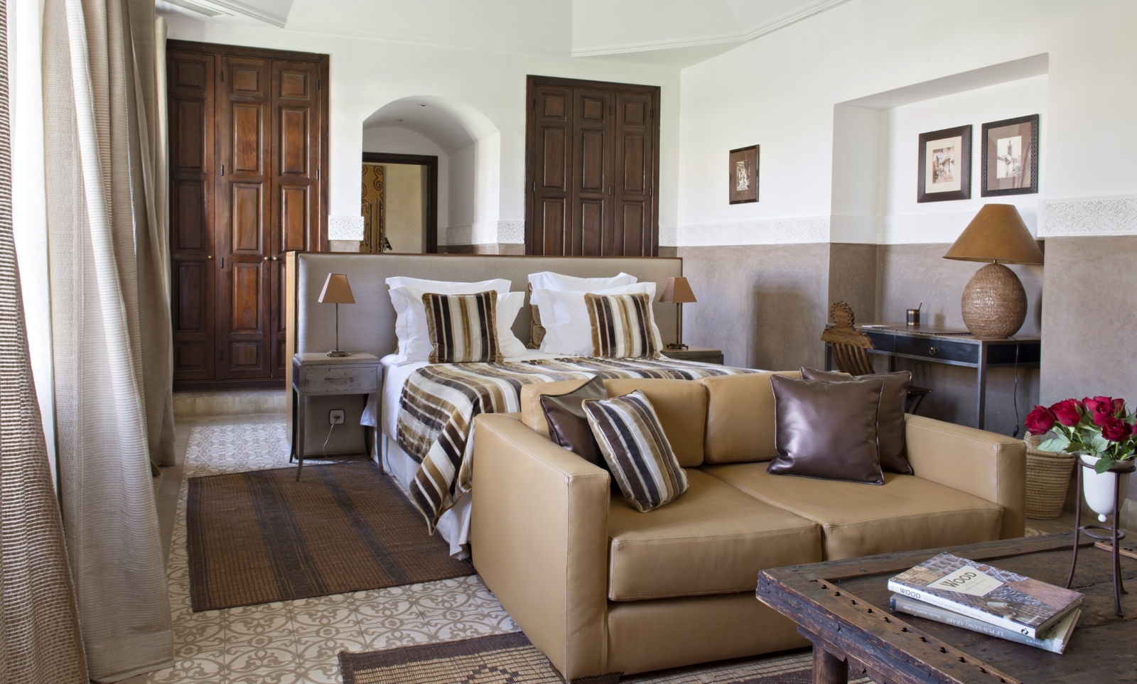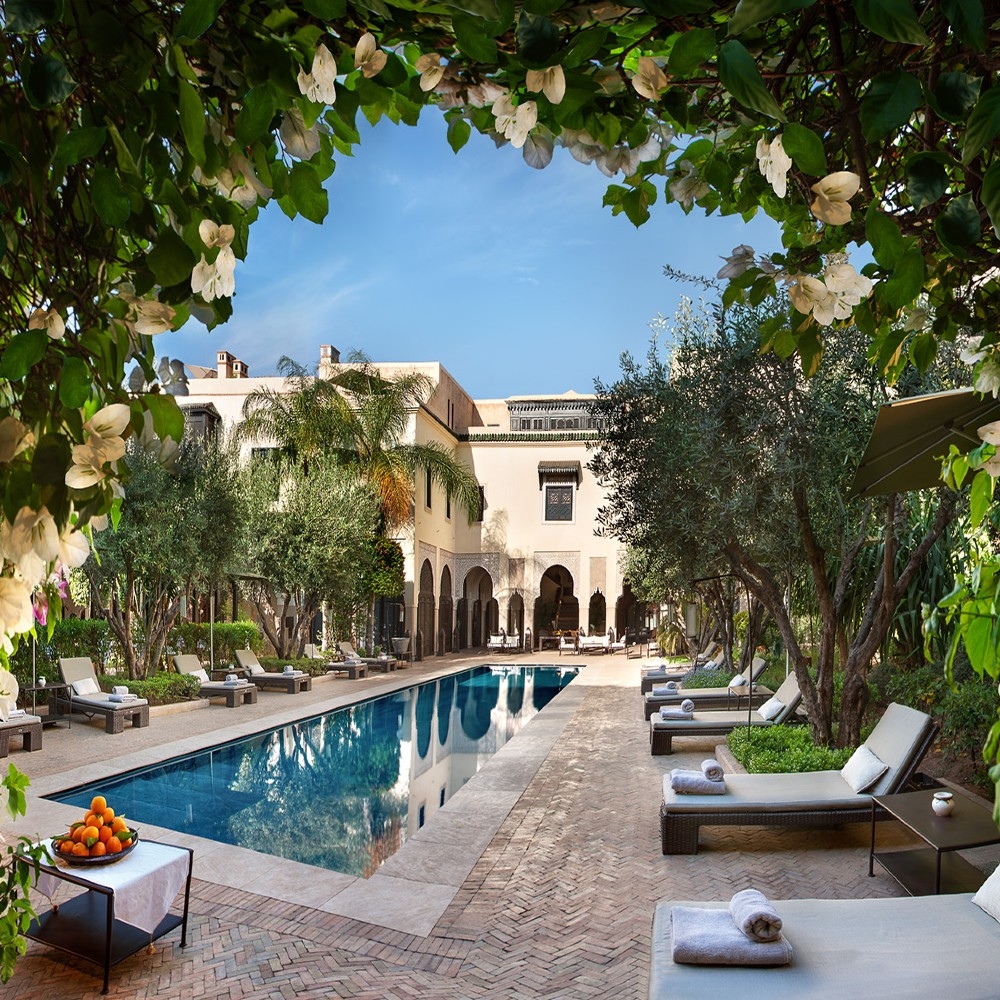 A sparkling swimming pool sits at the heart of the property (a can be found on the rooftop overlooking second rooftop overlooking the Koutoubia and Atlas Mountains), next to which is the excellent Mediterranean restaurant. Other spots to relax include fire-warmed lounges, a cigar cellar, an impressive hammam and a spa.