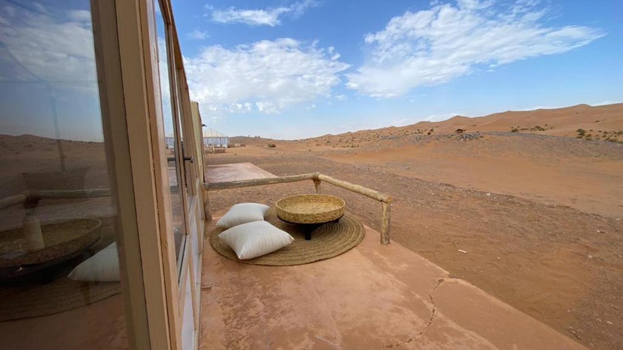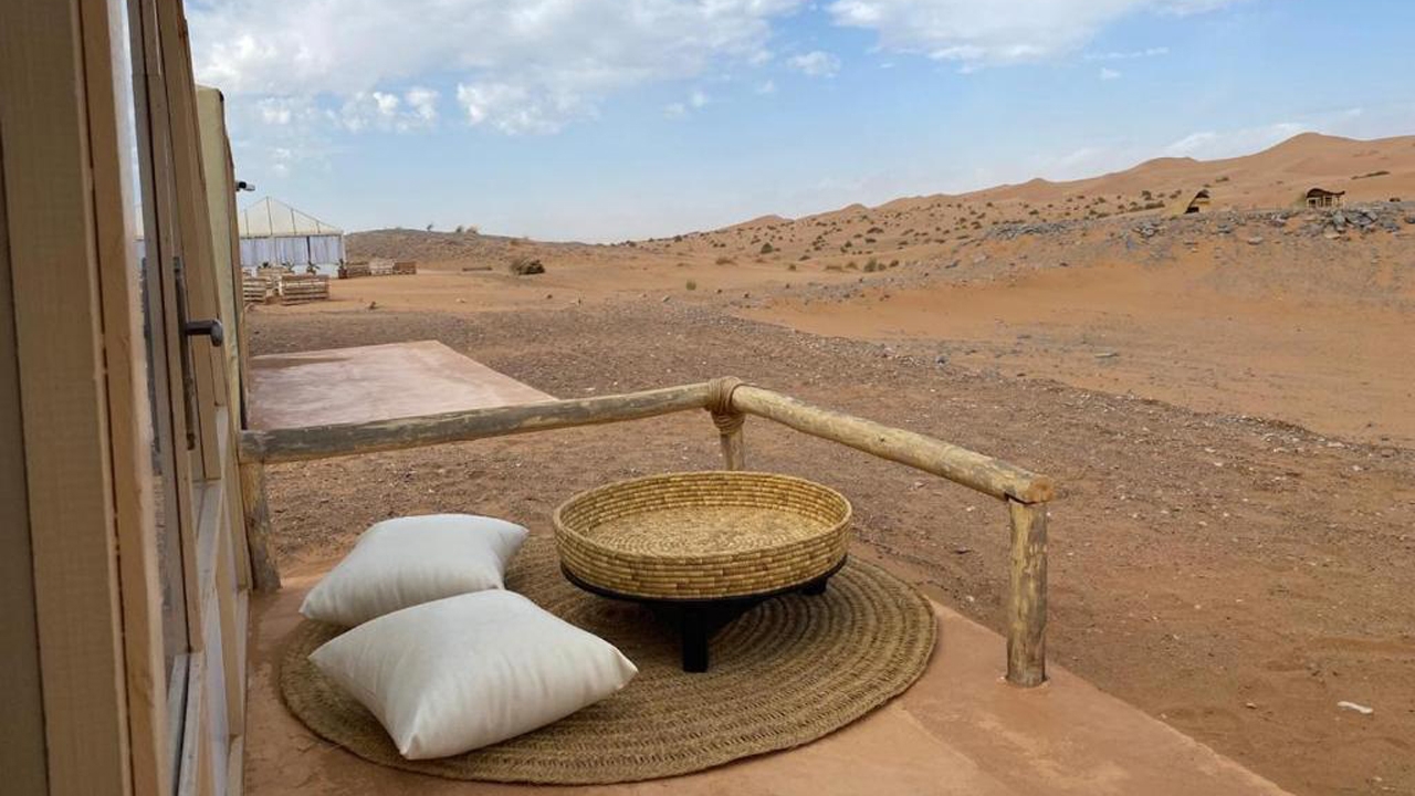 Surrounded on all sides by rippling sands that stretch to the horizon, you’ll find your tent set up for you, spacious and airy with a comfortable bed, sitting area and bathroom with reed mats, Berber cushions and vintage furniture.