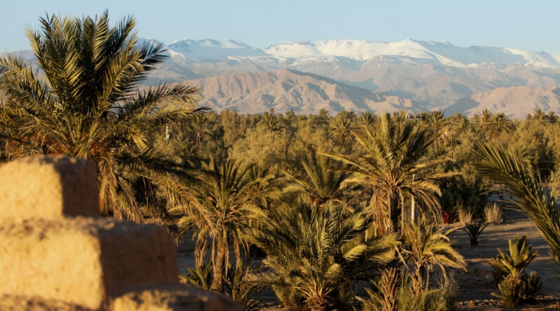 Skoura is an oasis town that sits south of the Atlas Mountains at the gateway to the Sahara and beyond. Once an important trading post where camel trains would offload spices and gold to be hauled over to Fes, its illustrious past can be glimpsed in the sand coloured kasbahs that still stand here today. The most famous of these is the imposing yet ornate 17th century Kasbah Amridil, and there are others well worth exploring, set romantically as they are between groves of date palms and backdropped by snowy peaks.