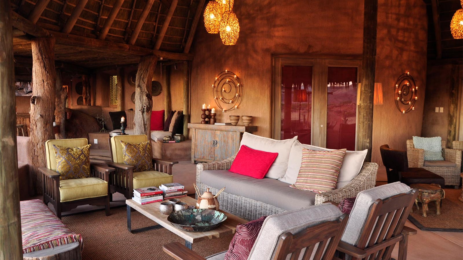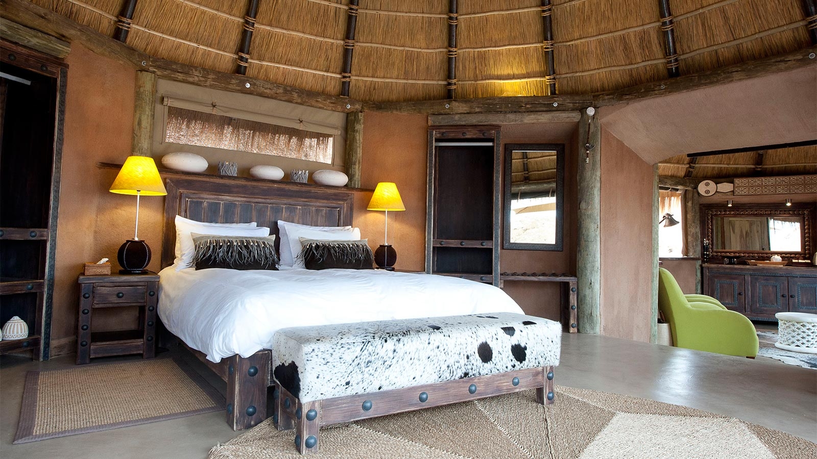 There are nine dome shaped rooms at Camp Kipwe and one sprawling, thatched roof suite. Natural touches such as rocks embedded in the floor and animals carved into the wood, mimicking the area’s famous engravings, add to the unique sense of place, as do incredible views out across Damaraland.