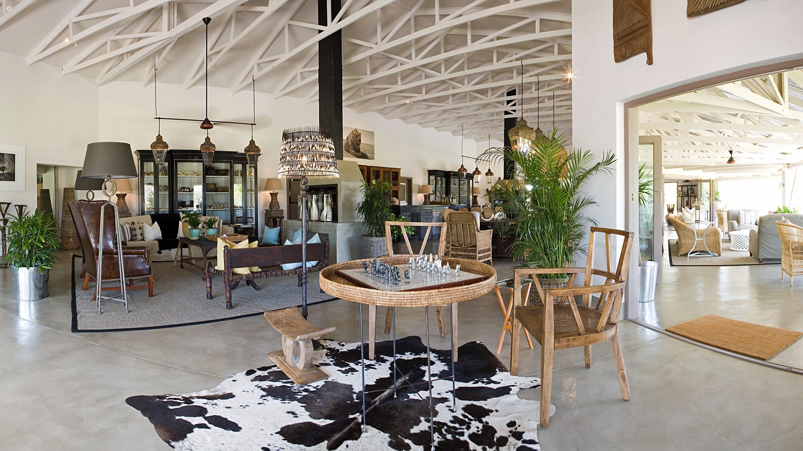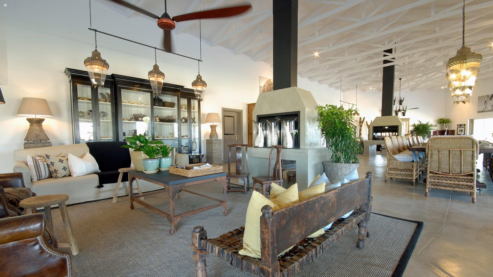 Main Lodge area with dining tables, camp fire, lounge and bar