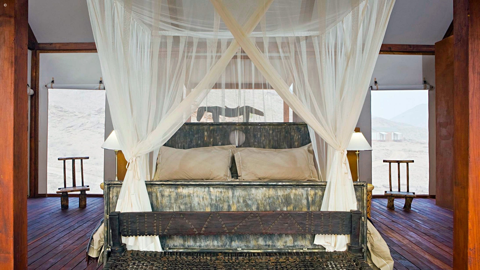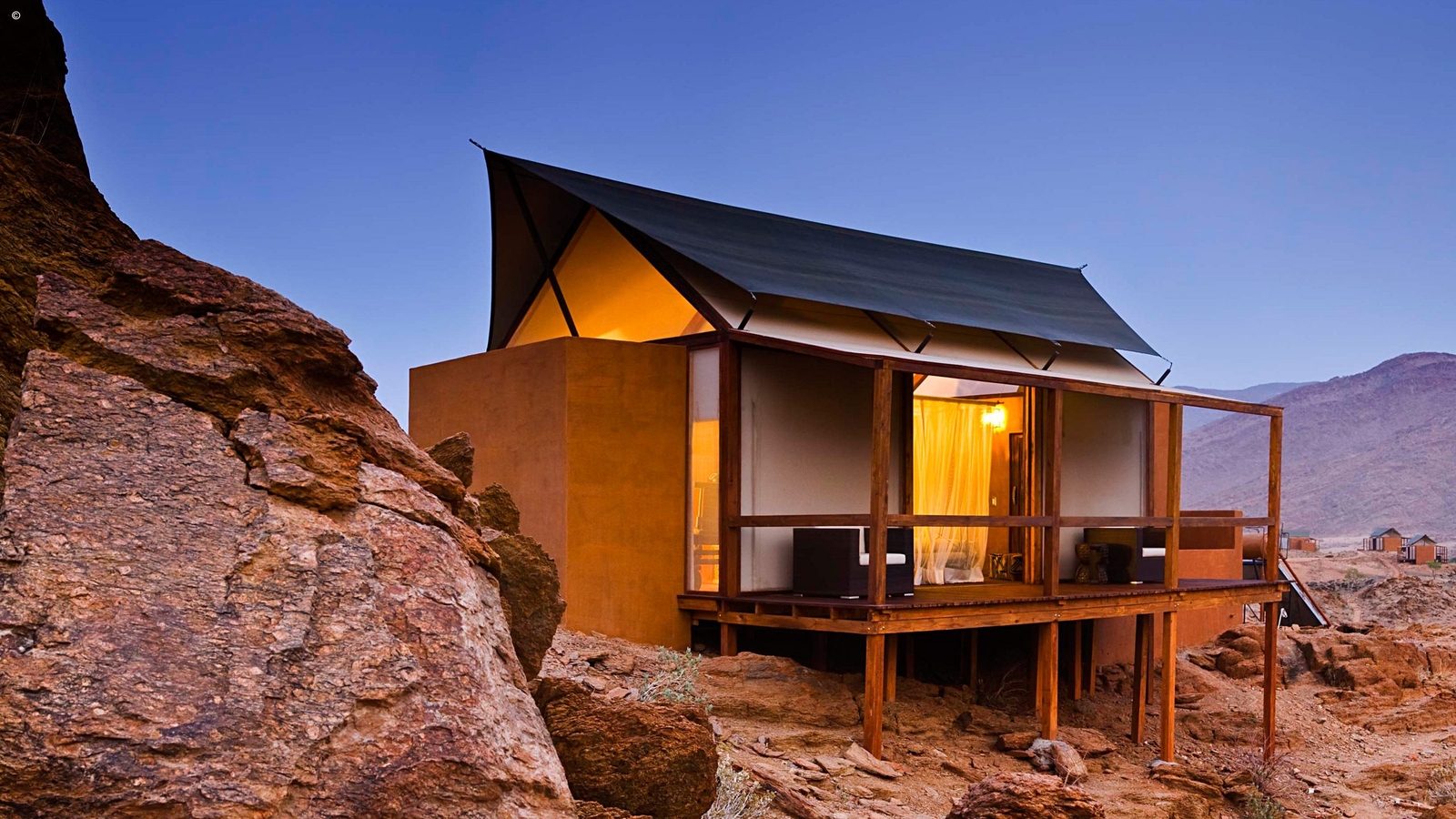 Scaling a ridge in the Marienfluss Valley and its central lodge built above the rapids of the Kunene, this is wild luxury at its best. The views are staggering with the colours constantly shifting into new ones depending on the time of day. Seven standalone wood and canvas rooms envelop you in the arid beauty at the same time delivering fine linen, a private terrace, indoor and outdoor showers, and a naturally stylish and eco-friendly ambience.