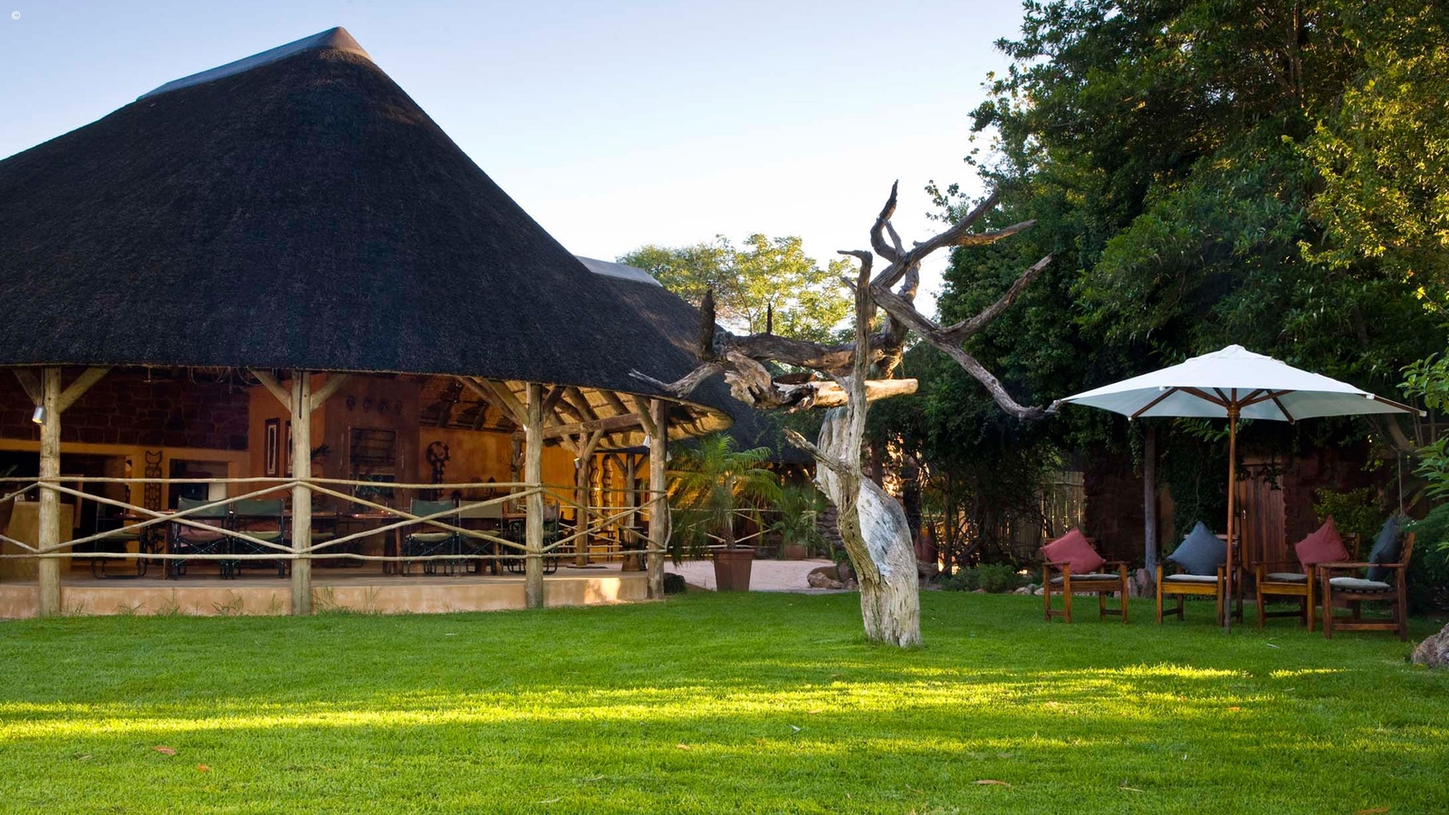 Once an original family farmhouse, Okonjima Plains Camp is now a thatched lodge with an informal atmosphere and elegant rooms that look out to sprawling plain views.
