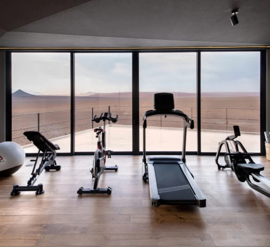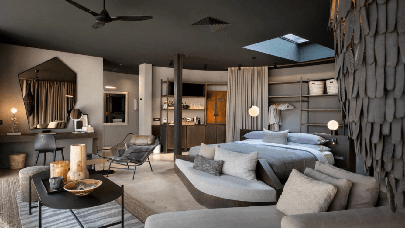Each air-conditioned suite features a private veranda, split-level bedroom and living room with fireplace, en-suite glass-encased bathroom and outdoor shower. The villas are equipped with a stunning star-viewing skylight, discreet CD system, custom-stocked personal bar and compact spotting scope for magnificent star and game viewing. The guest area, where walls have become windows that fold away completely, boasts unimpeded desert vistas.