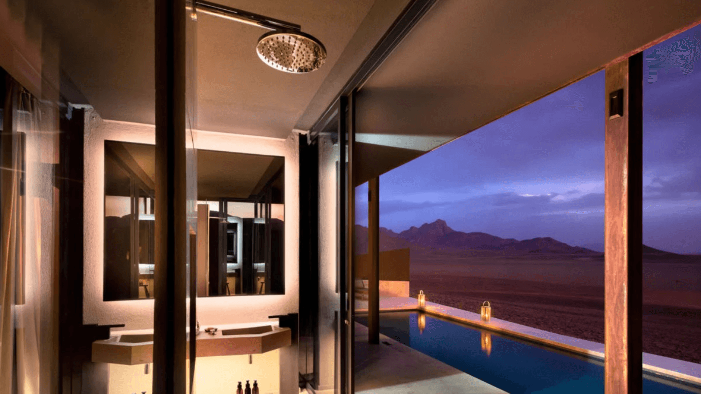 Designed to capture the splendour and solitude of the desert, just ten stone and glass desert villas spread out along the curve of the escarpment allowing absolute privacy.