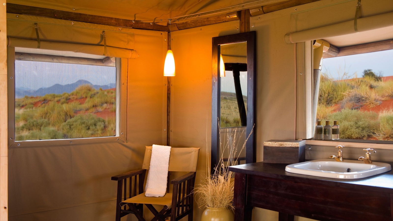 The camp is located on top of a 250-foot sand dune lending it spectacular views and a pristine setting. Each tent sits on a wooden platform with its own private bathroom and a deck that overlooks the expansive desert and the star-littered night sky. Canvas windows can be rolled up for unrestricted views and desert breeze for an authentic safari feel.