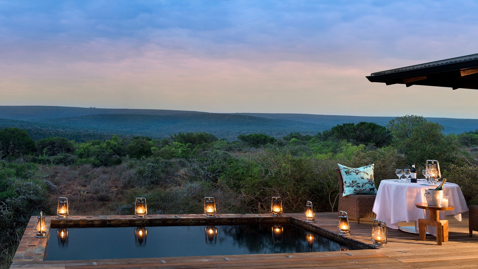 Six rooms are surrounded by wraparound timber decking, private plunge pools and a scenery of Kwandwe Private Game Reserve’s rolling hills thick with acacia and aloe trees.