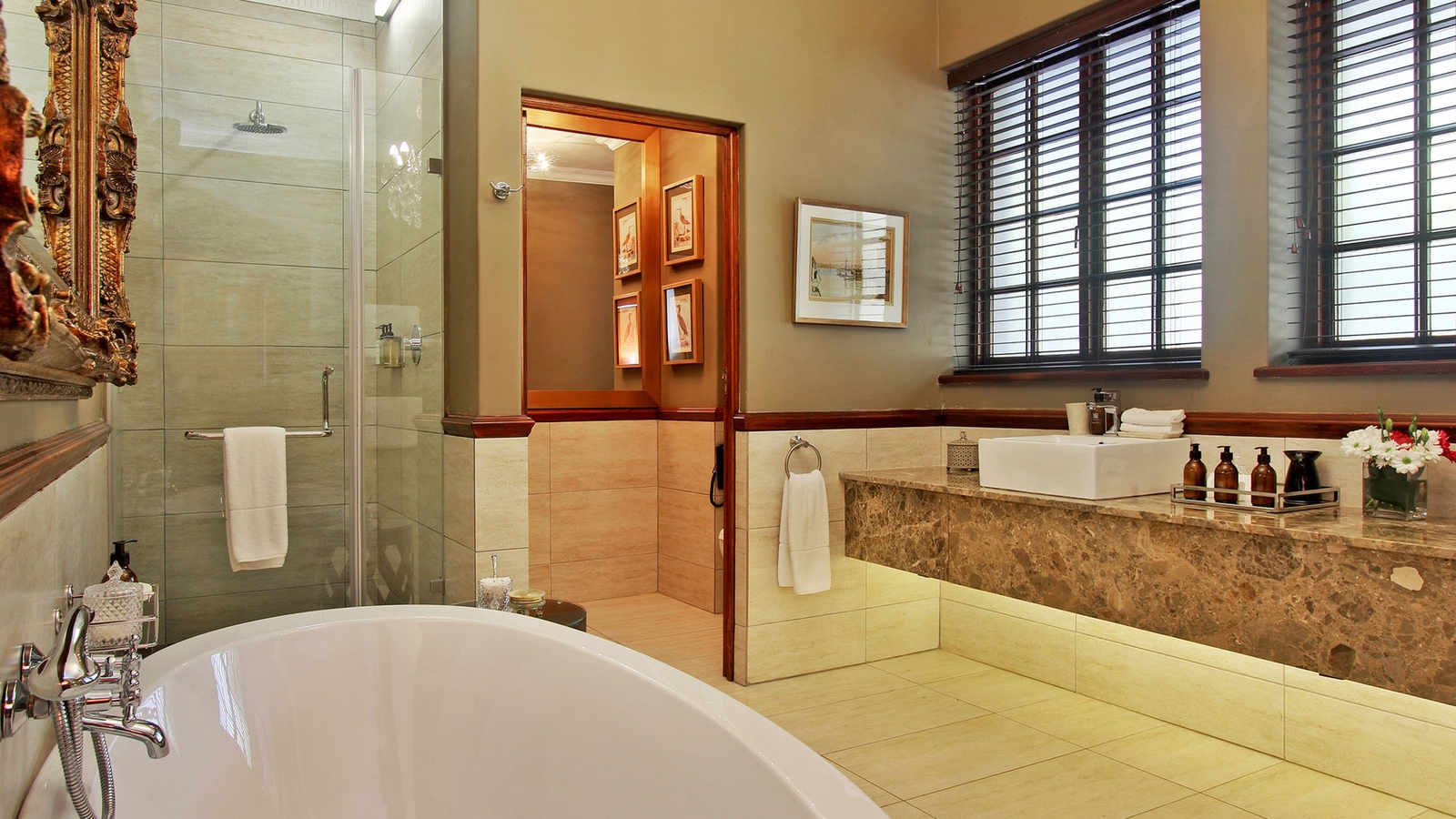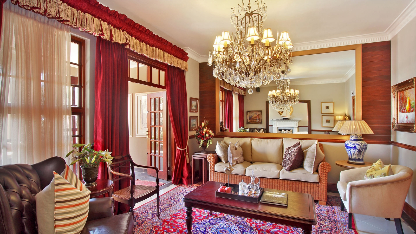 The entrance hall leads through to the sumptuous lounge and sitting room with plush furnishings inviting carefree relaxation for all seasons. A cosy log fire is lit in the fireplace on chilly days, while doors opening onto the long, spacious veranda offer a cool respite from the warm African sun.