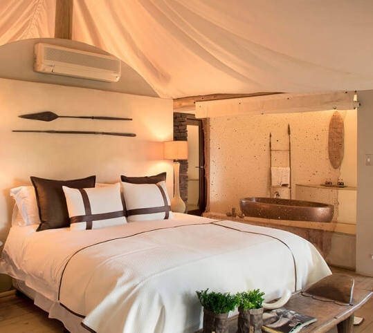 The 15 luxurious canvas and stone tented suites are private sanctuaries, reflecting the natural surroundings with a contemporary twist, with bathrooms that have deep stone carved bath tubs as well as indoor and outdoor showers.
