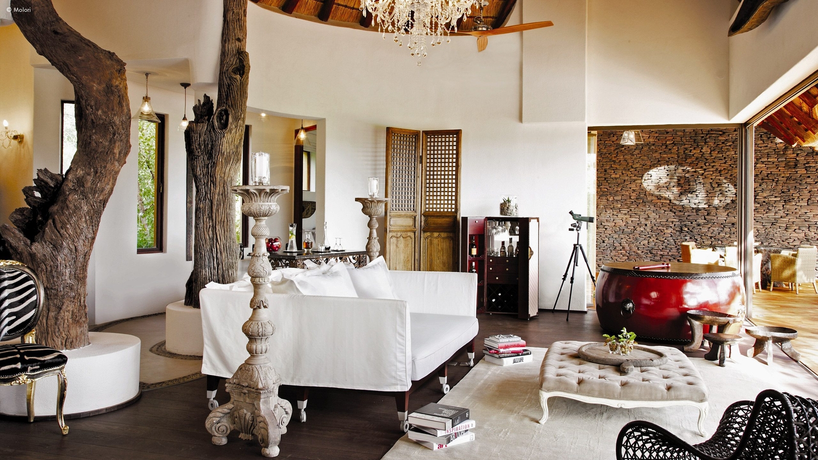 At the hand of celebrated South African interiors master Stephen Falcke, the lodge’s perfectly attuned style is not too overboard to disconnect you from the surroundings. A well-balanced blend of international fittings and furnishings sit well next to more regional equivalents and art, a good example being the glass chandeliers that dangle from the steep thatch-roof ceilings.