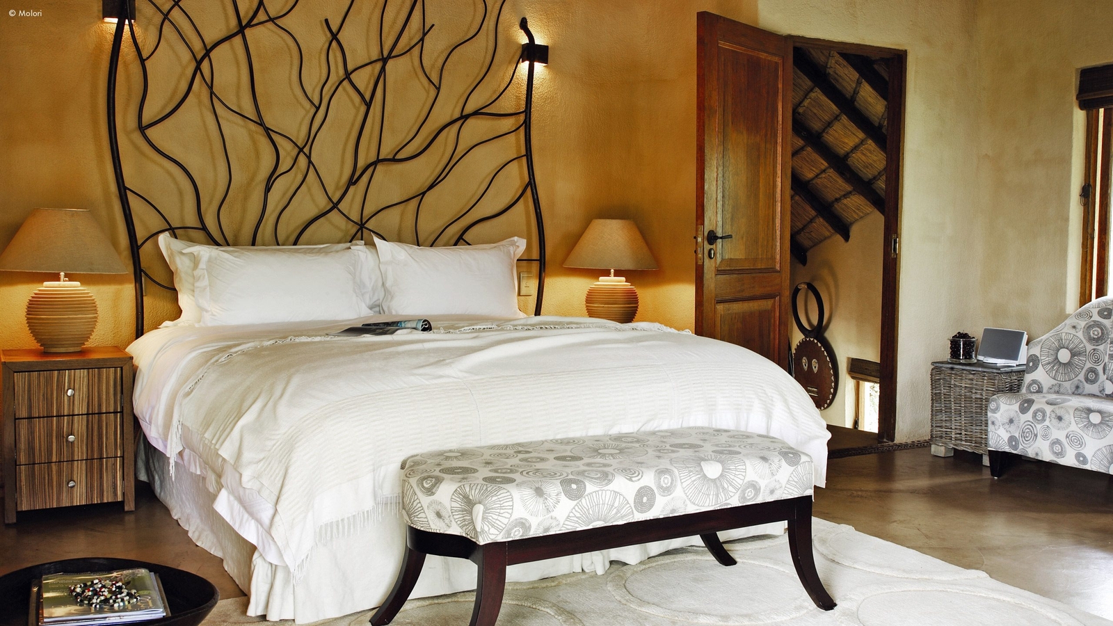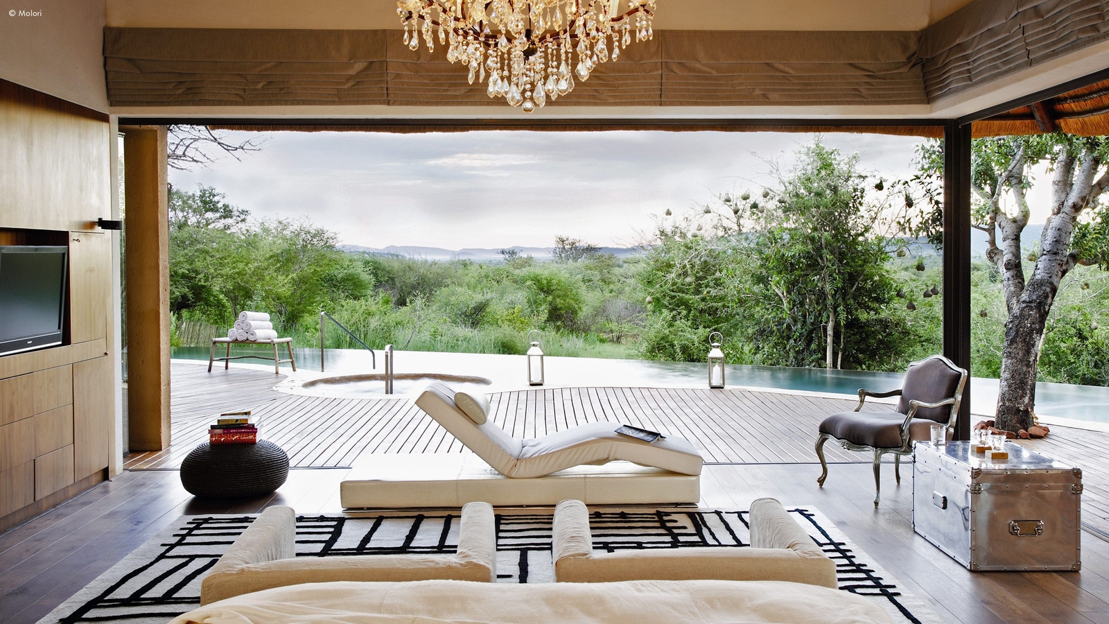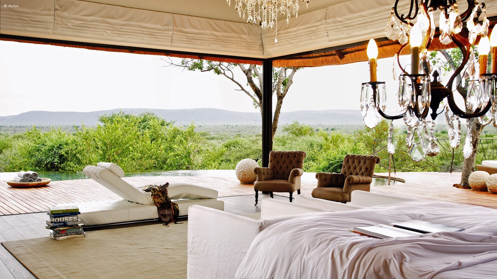 Molori’s five vast suites are distanced for more privacy and designed to the starry heights of infinite, open-sided African chic.