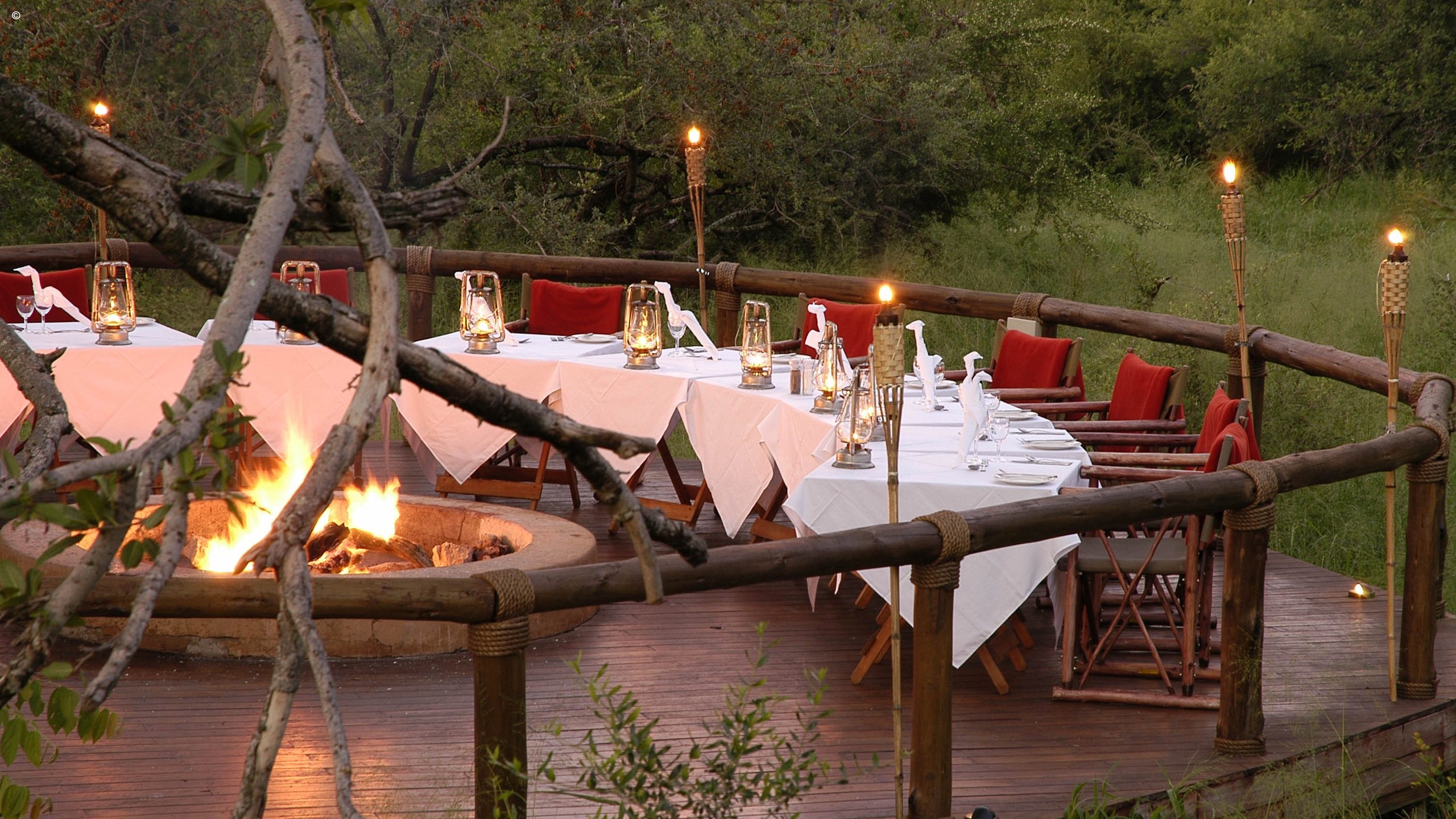 The main decking area of the lodge overlooks a watering hole and a small pool and comfy loungers makes it the perfect place to simply sit and marvel at the scenery and wildlife. The boma is a beautiful setting for your meals, where you’ll enjoy delicious cuisine under the shade of a giant fig tree. In the evening the twinkling of candles, lanterns and the night sky make dining here an unforgettable experience.