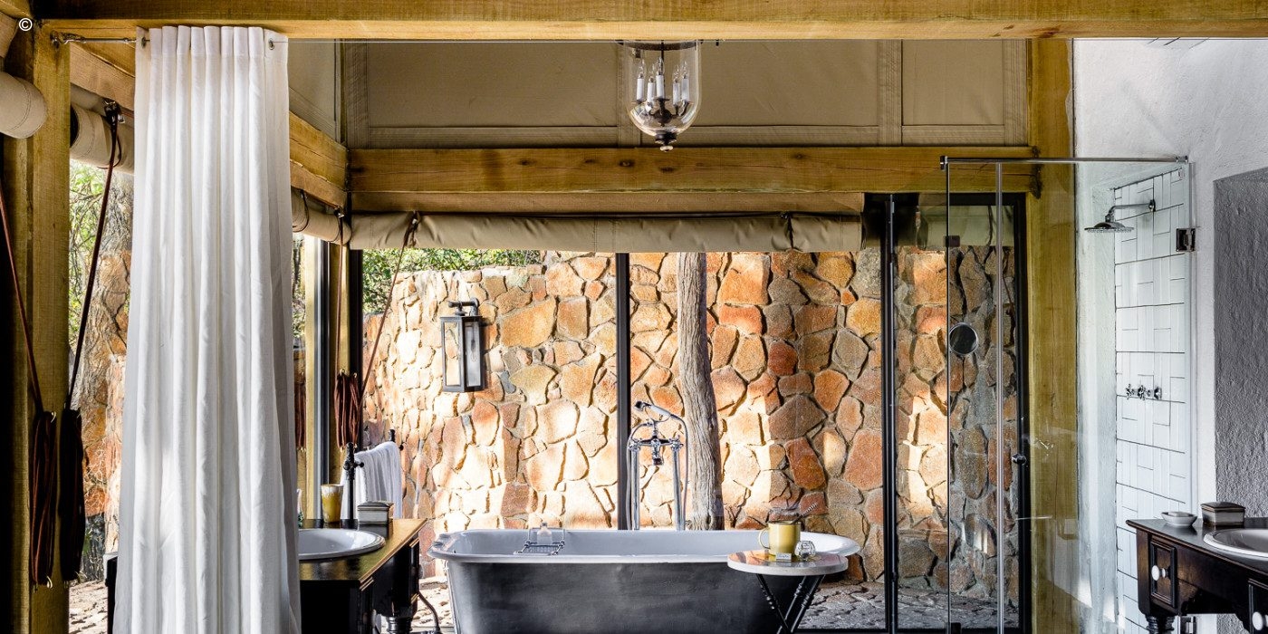 Your suite has been decorated according to a black and white colour scheme in homage to the big ebony trees that surround the lodge and interiors are furnished with vintage campaign furniture from Luke Bailes’ (the founder of Singita) family collection, sepia photography, tribal print murals and imitation leopard and zebra-print fabrics. Interior walls have been replaced by canvas or glass to create a light and airy atmosphere and to capitalise on the amazing views outside, to beautiful effect in the bedroom where you’ll enjoy an uninterrupted view out onto the terrace.