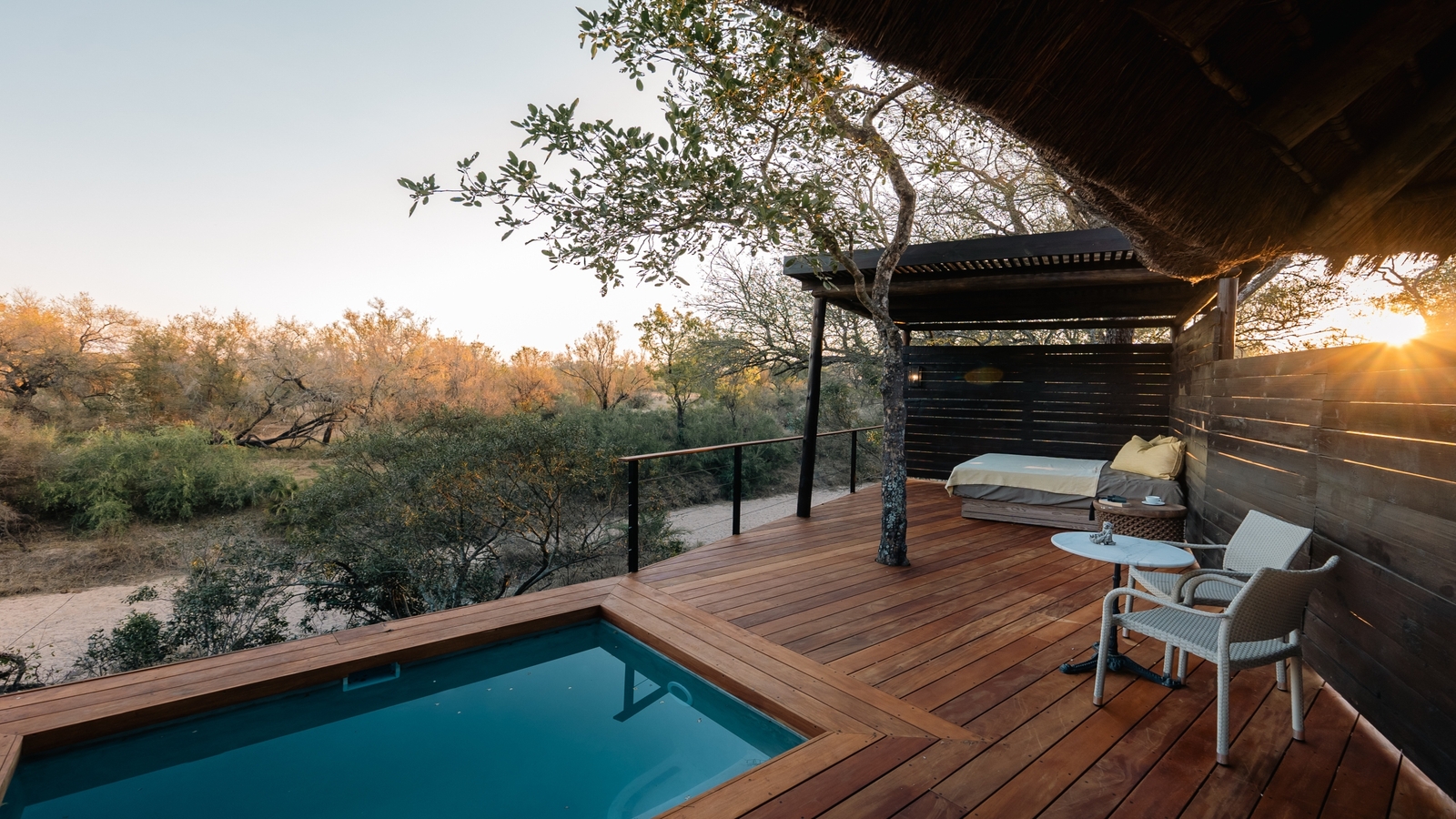 Between thickets of tall jackalberry and knobbly knobthorn trees that seasonally bloom with soft, sweet-scented flowers, Simbambili Game Lodge looks onto the meandering Manyeleti River in the Sabi Sand Game Reserve, part of the world-renowned Kruger National Park. With such nature all around beloved by wildlife, including the numerous watering areas, sightings of giraffes, elephants, warthogs and more are delightfully plentiful.