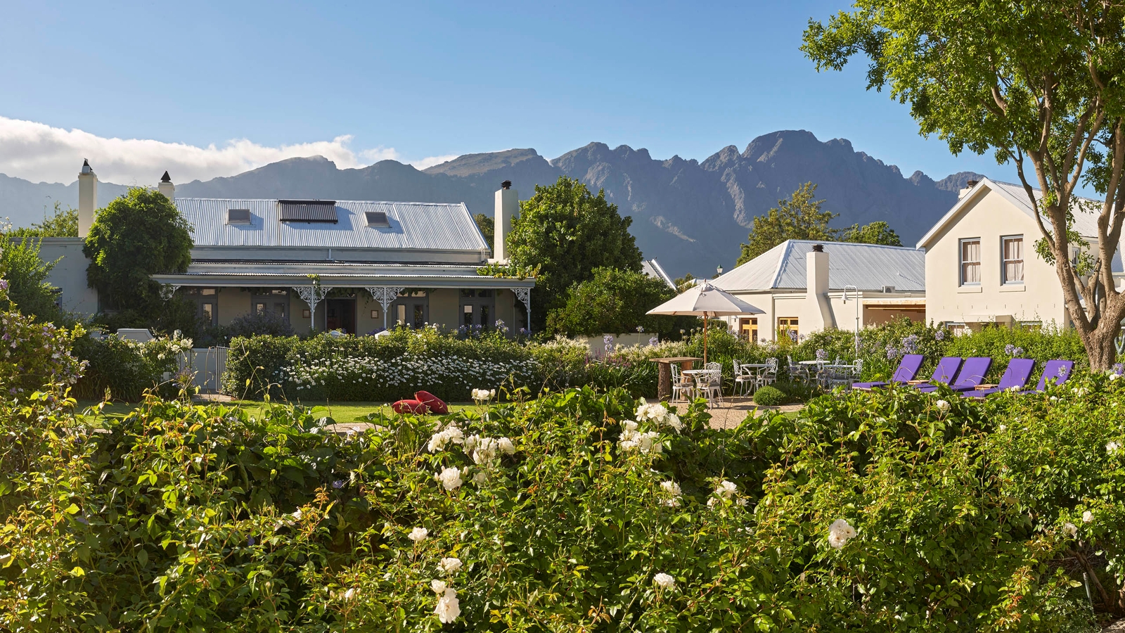 The white exteriors contrast with the warm, colourful interiors of the rooms, all very comfortable and spacious. The hotel also has two excellent dining options which front onto the main high-street of Franschhoek. Guests can also enjoy a pleasant lounge area, herb garden and private cinema. The ‘La Petite Colombe’ restaurant is among the best in South Africa.