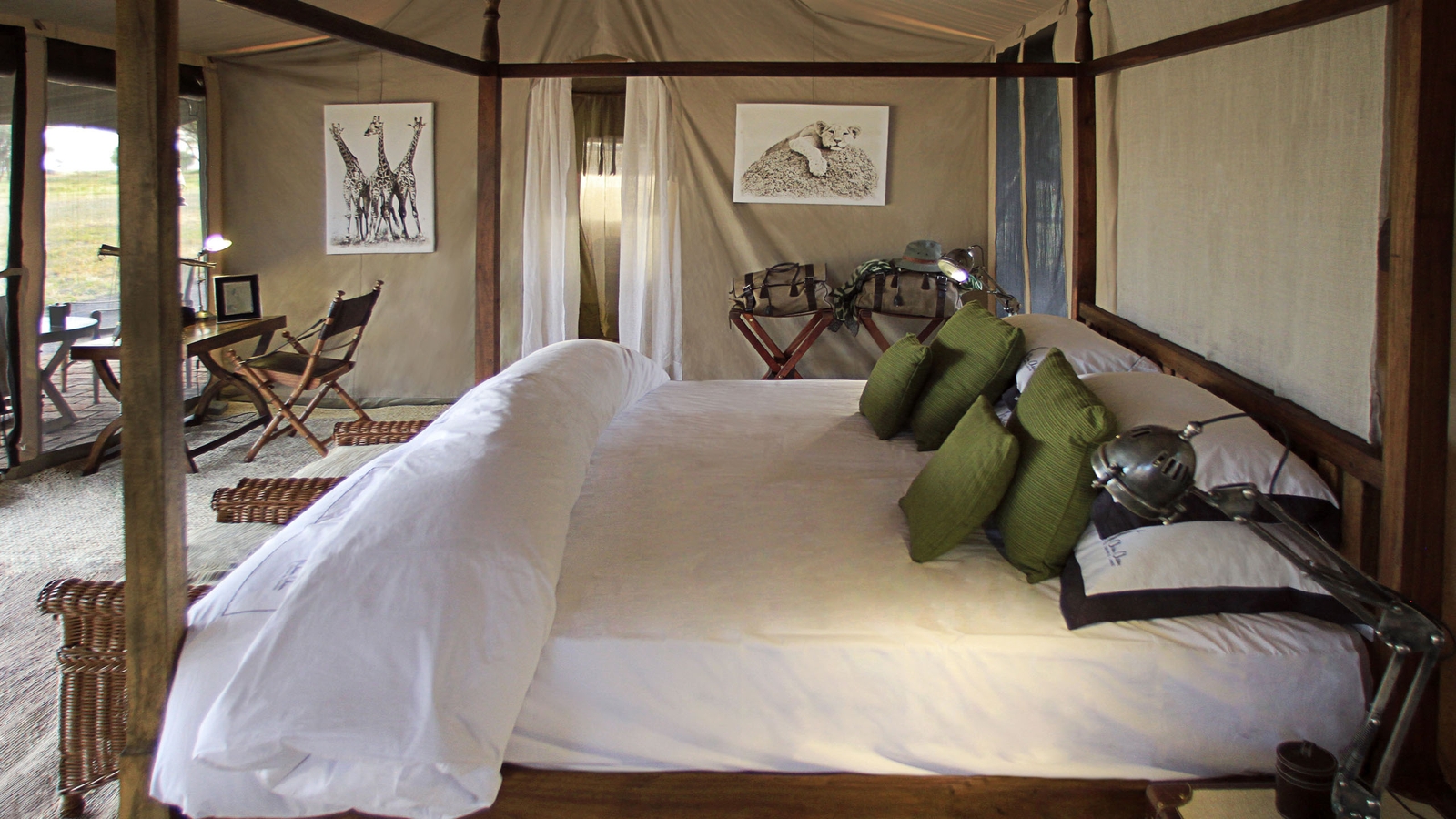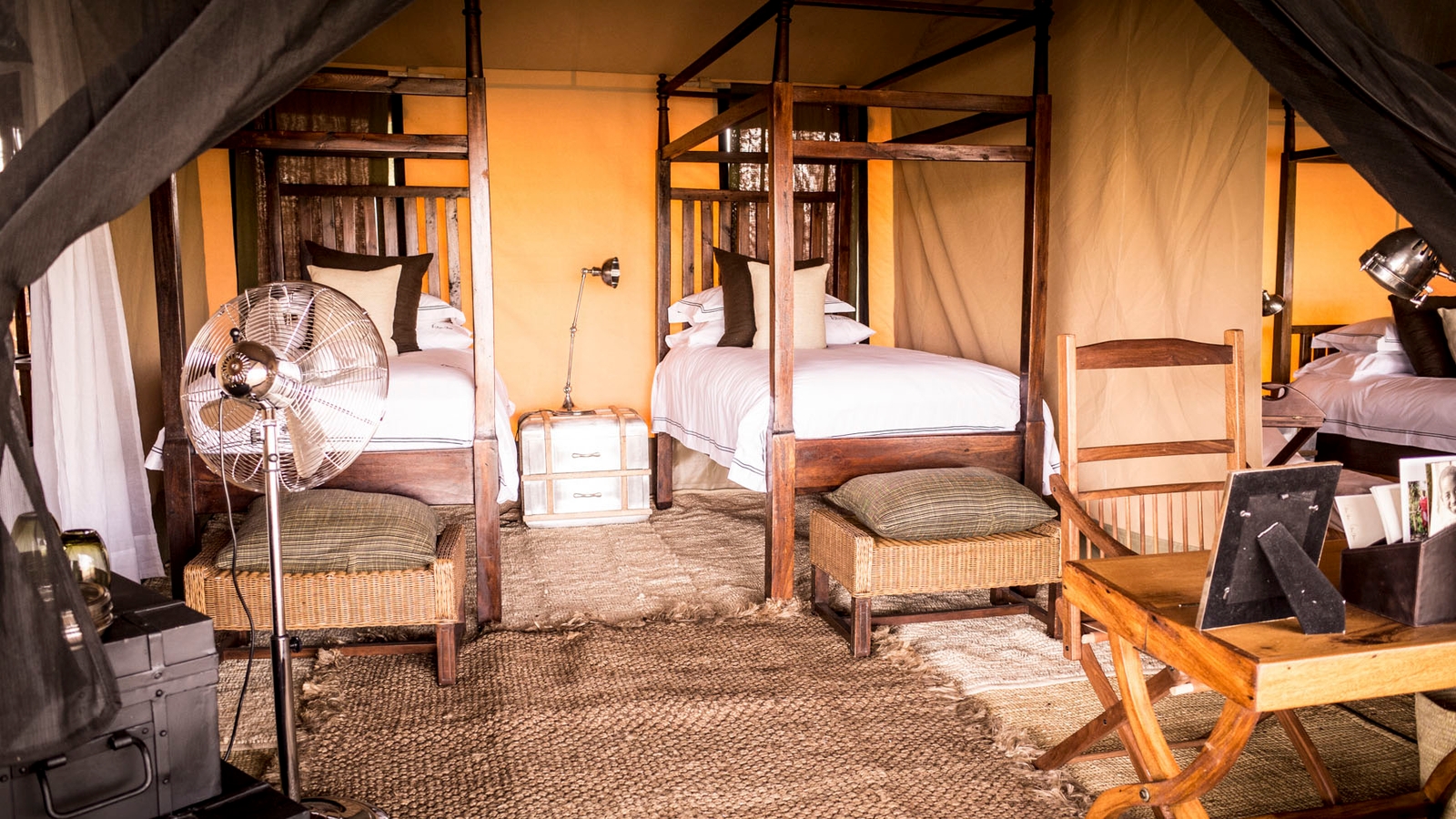 Six tents are far from basic, with en-suite shower rooms housing hot-water bucket showers and flushing toilets, a study desk, rocking chair and a dressing room. Outside, find a private fire pit whose crackles twinned with the sound of the African wilderness at night evoke a prehistoric notion of place.