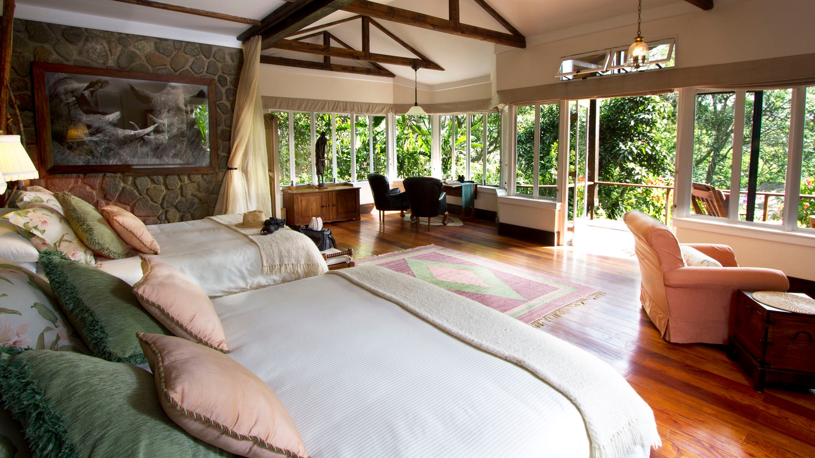 This is a wonderfully comfortable and charming lodge, set in a working farm within the Ngorongoro Conservation Area. A short drive from the famous Ngorongoro Crater surrounded by forest and gardens Gibb’s Farm gives you some peace and quiet away from the bustling traffic that congregates around the busy crater rim. This interesting working farm is a great place to get out of the safari vehicle and walk the 95 acres of farm and forest that make up Gibb’s. The farmhouse itself is surrounding by rather charming English gardens and where you can simply relax and enjoy the organic coffee that is processed and roasted just outside the door of the lodge.