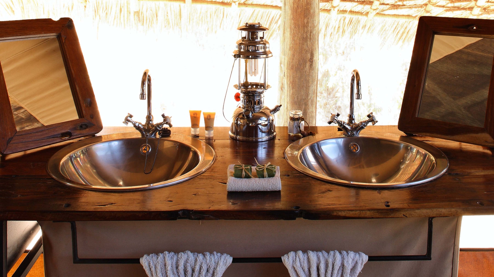 The camp features a bar, lounge, restaurant, pool and an open wooden terrace shaded by a high thatched roof and filled with comfortable sofas and striking furniture made of reclaimed dhow wood. The camp’s eight tented-rooms are built on raised wooden platforms and housed under thatched roofs. Each has it’s own bathroom and a spacious private veranda overlooking the riverbed.