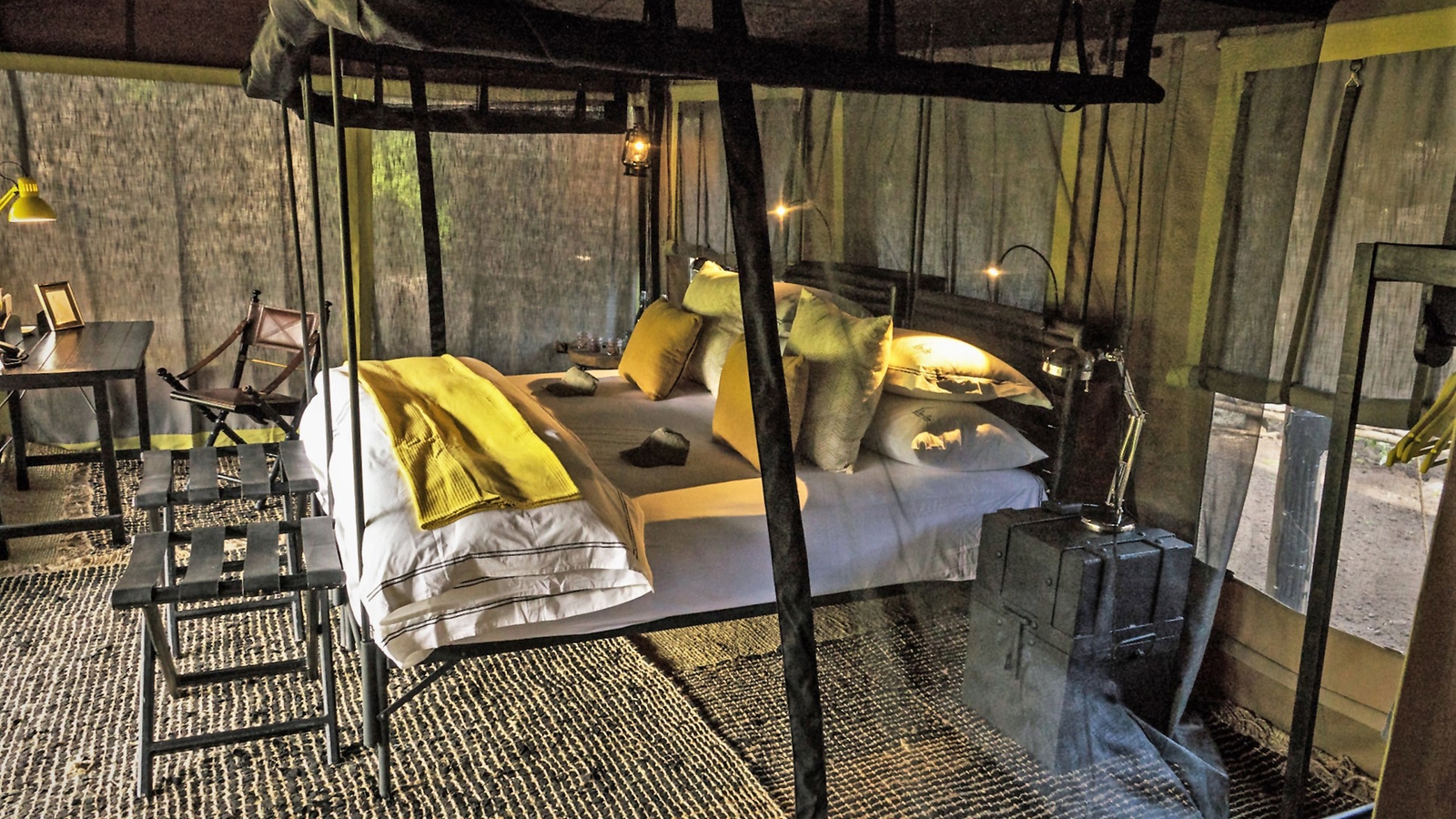 The camp consists of two vintage-style safari tents and one two-bedroom family tent, all with indoor and outdoor showers. Accommodating up to six adults and two children, it is perfect for families or small groups looking for an intimate safari experience. A soft yellow, grey and black colour scheme is carried throughout the camp, and there is an elegant lounge tent, a fire pit and outdoor swing bed.