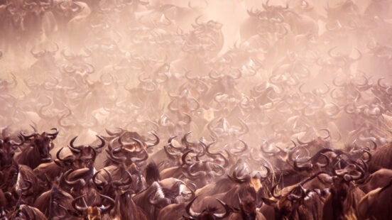 Throughout the year, the wildebeest herds travel around Tanzania’s Serengeti National Park.