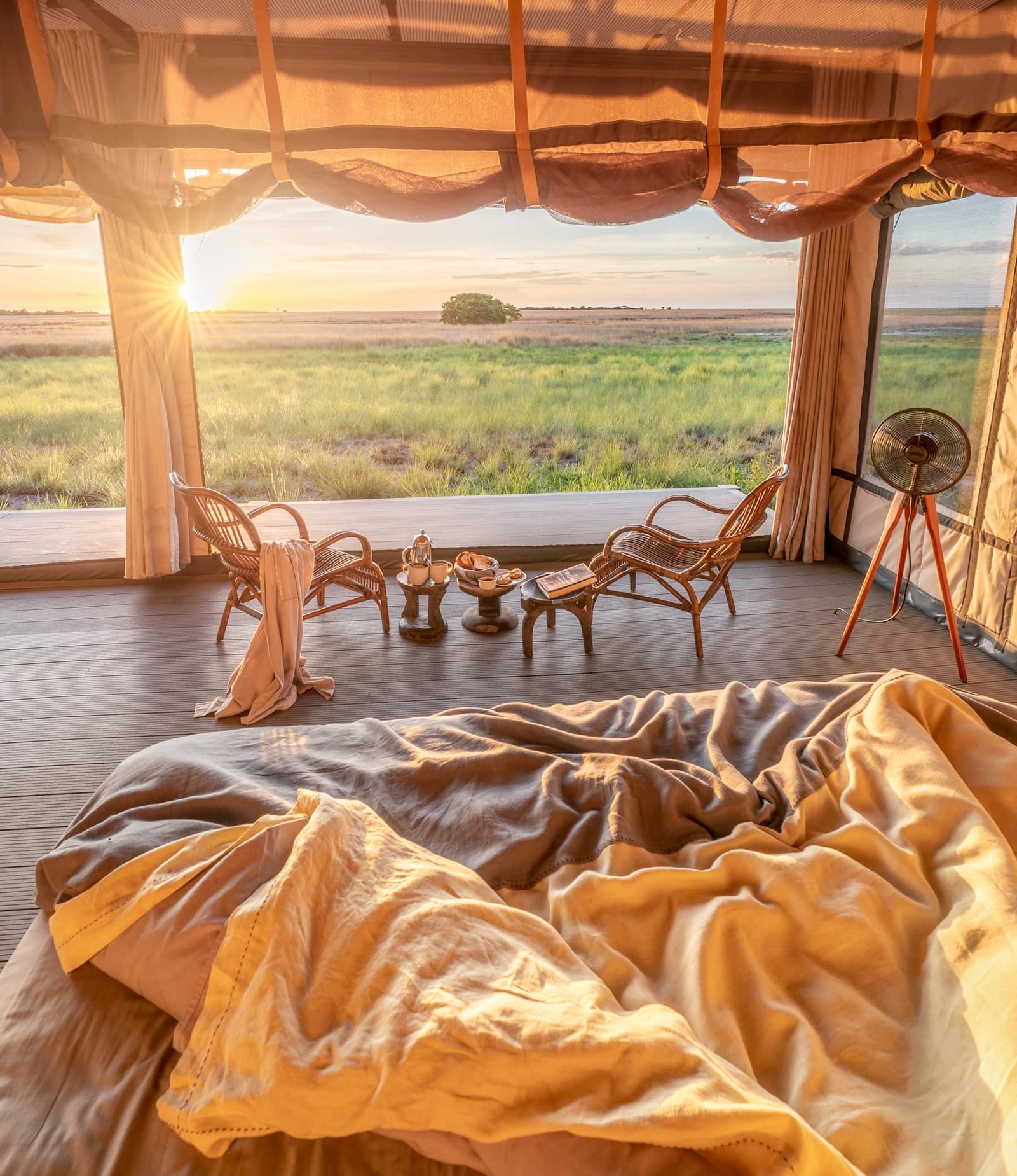 There are just six spacious tents here sat on platforms which open up dramatically to the surrounding plains and feature both indoor and outdoor showers. One is a family suite which features one double and one triple room. The communal thatch building has lounge, dining and bar areas, with stairs leading down to a fire pit.