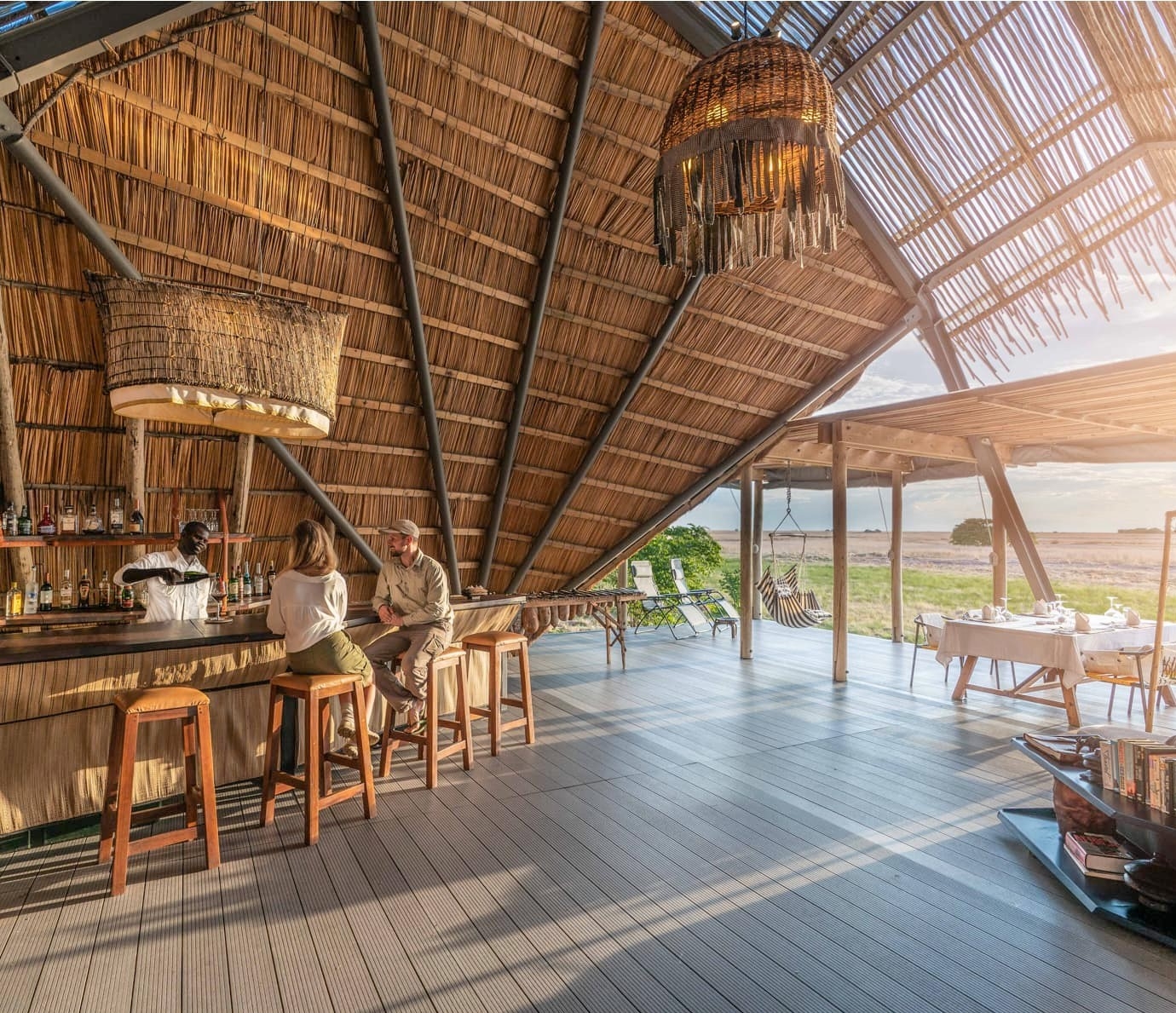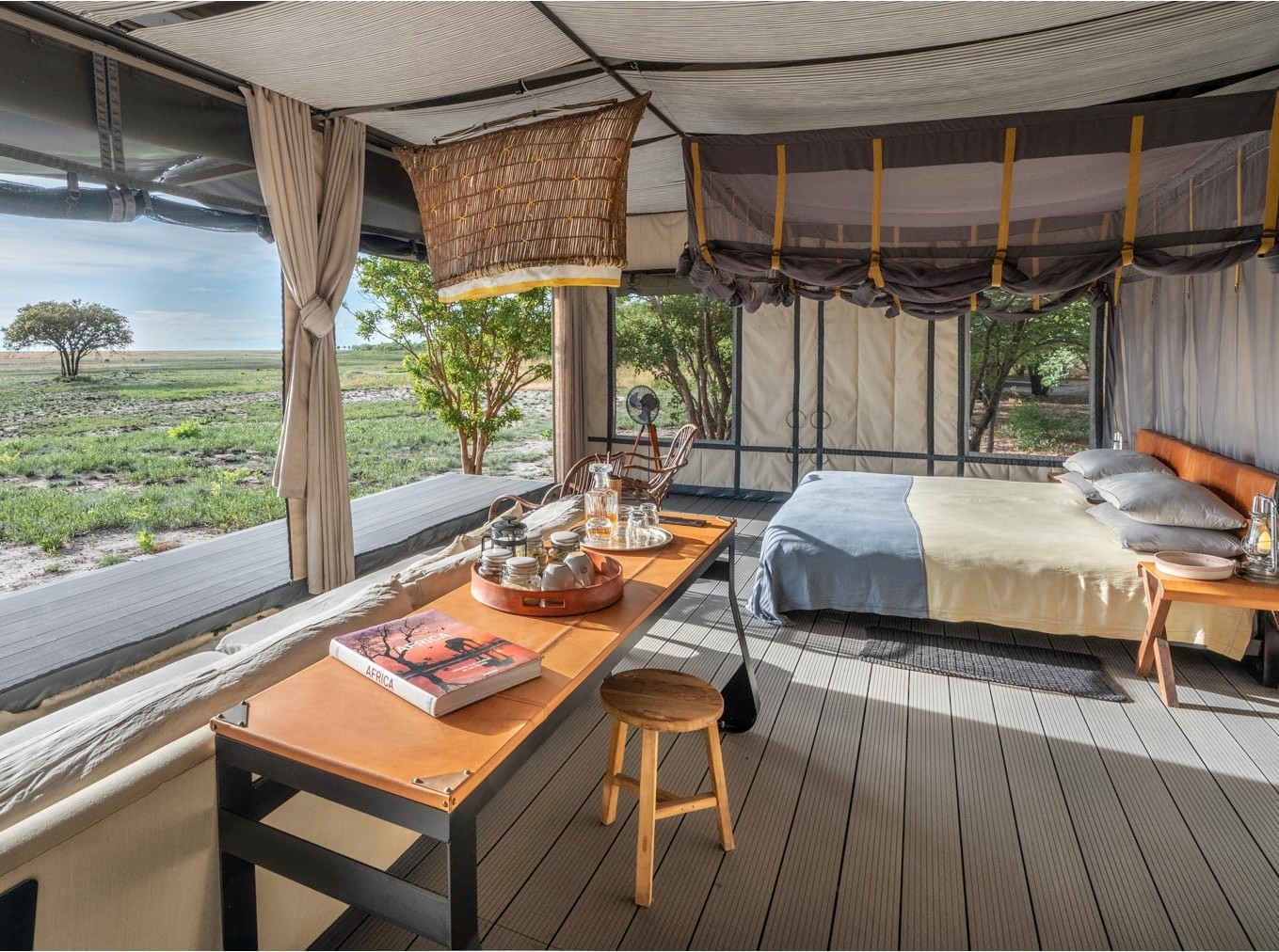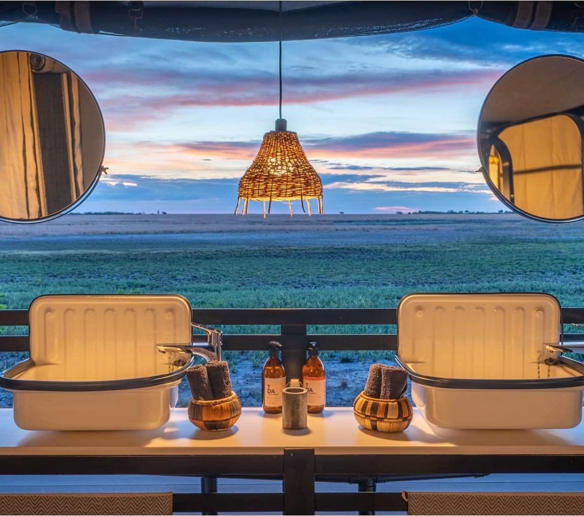 The camp is a beautifully modern take on the traditional safari camp, retaining features and simple materials such as canvas drops, leather and wooden decks overlooking the wilderness with local thatch and grass in the main area in a refreshingly simple, sustainable, and meaningful way.