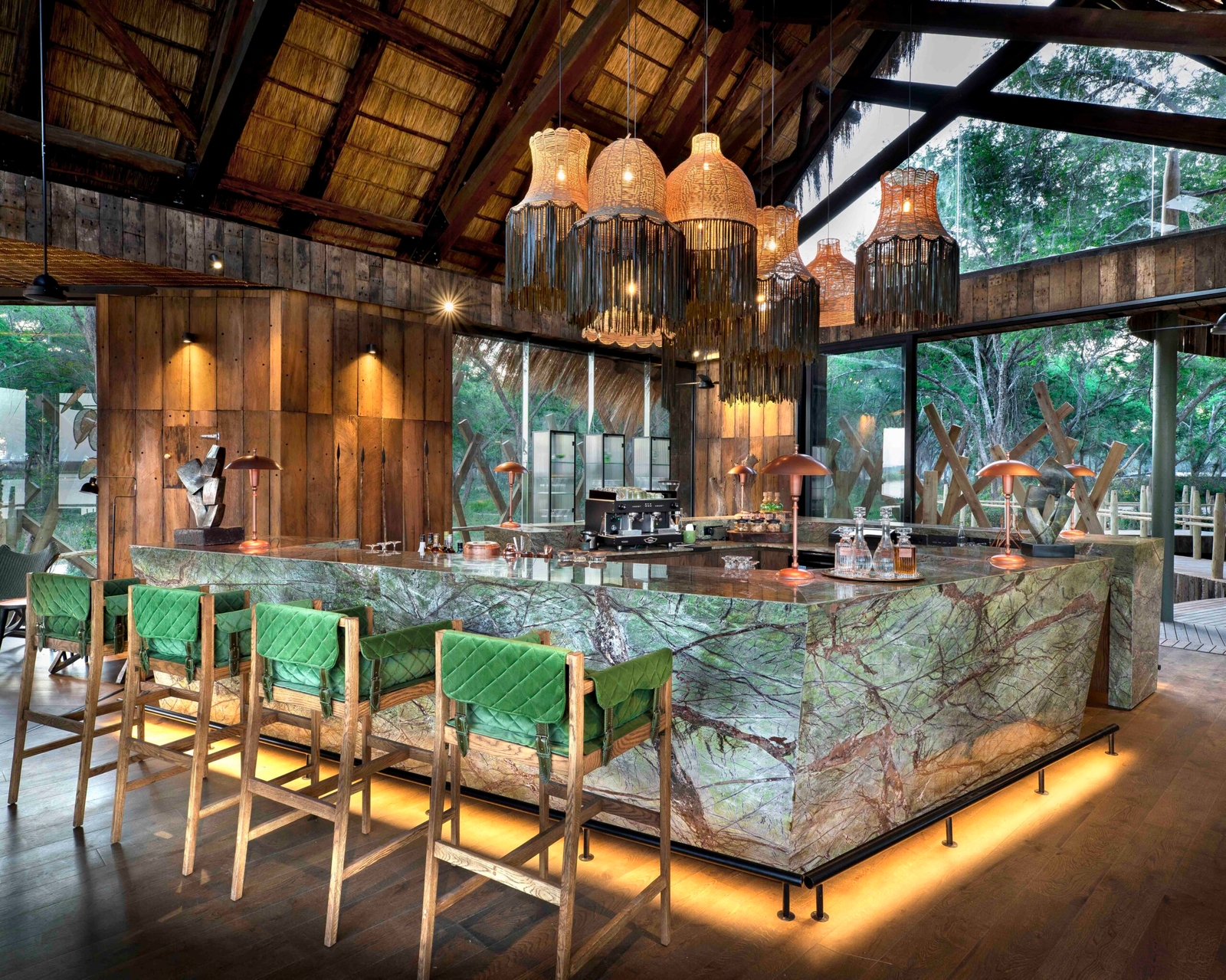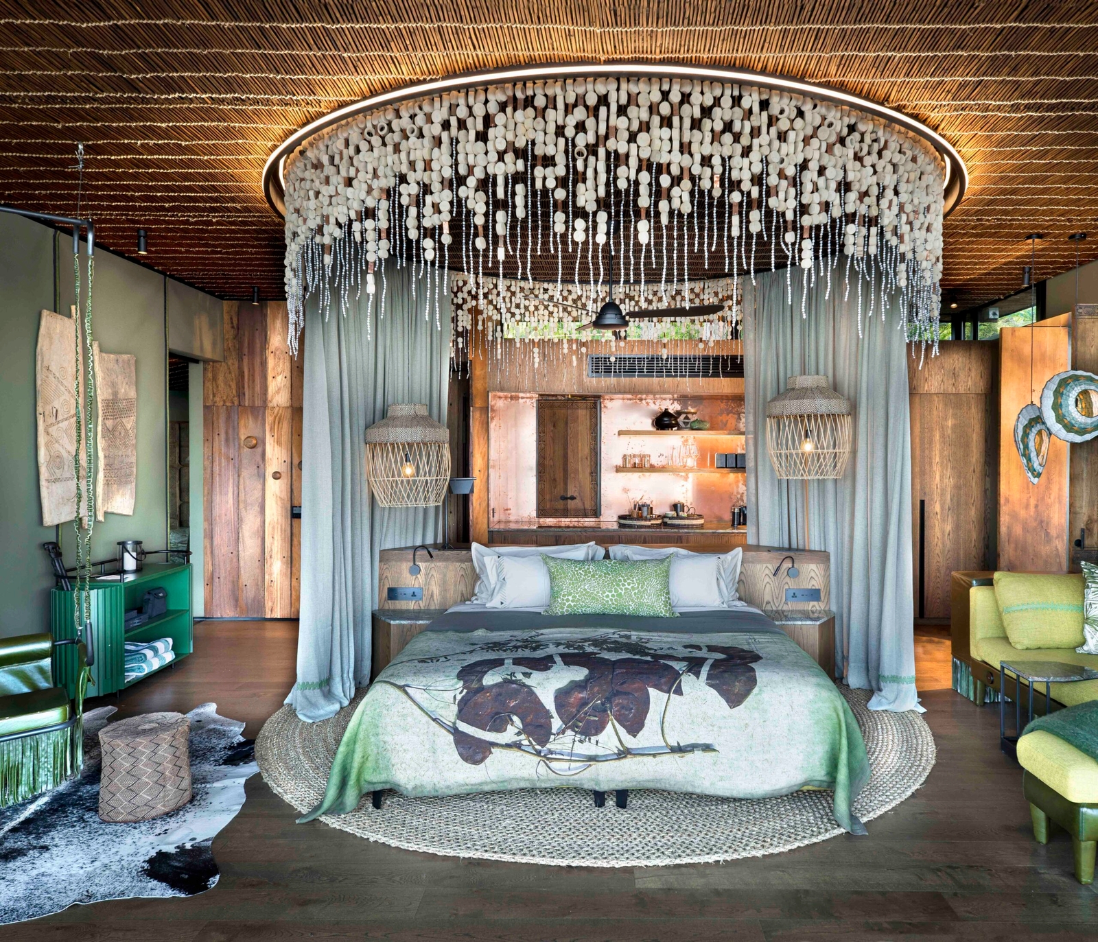 Lolebezi’s design embraces both contemporary elegance and African heritage, set amidst the majestic Acacia trees. Dotted throughout the lodge are artworks which honour the local culture and craftsmanship. Natural materials, like green rainforest marble, are skillfully incorporated throughout, enhancing the lodge’s integration with its surroundings. Each private suite here is a haven of luxury, with spacious bathtubs and serene plunge pools overlooking the Zambezi River. The suites boast marble vanities and both indoor and outdoor showers.