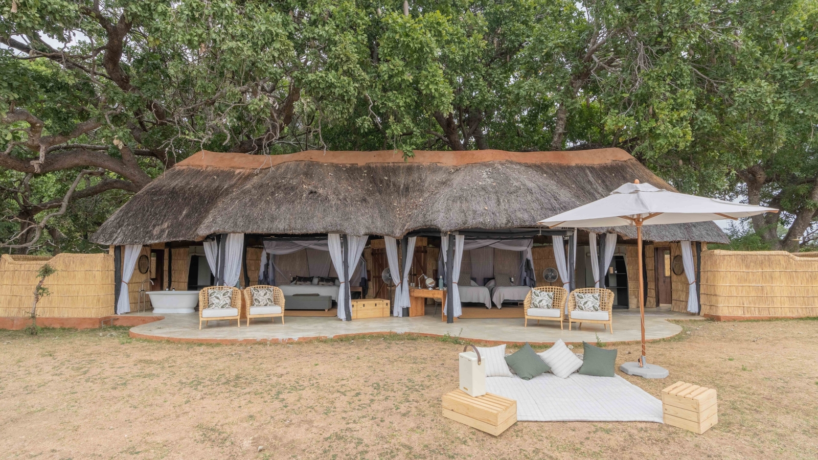 A quietly luxurious bush camp, Mchenja sits in under the shade of a grove of ebony trees on the banks a great sweeping bend in the Luangwa River.