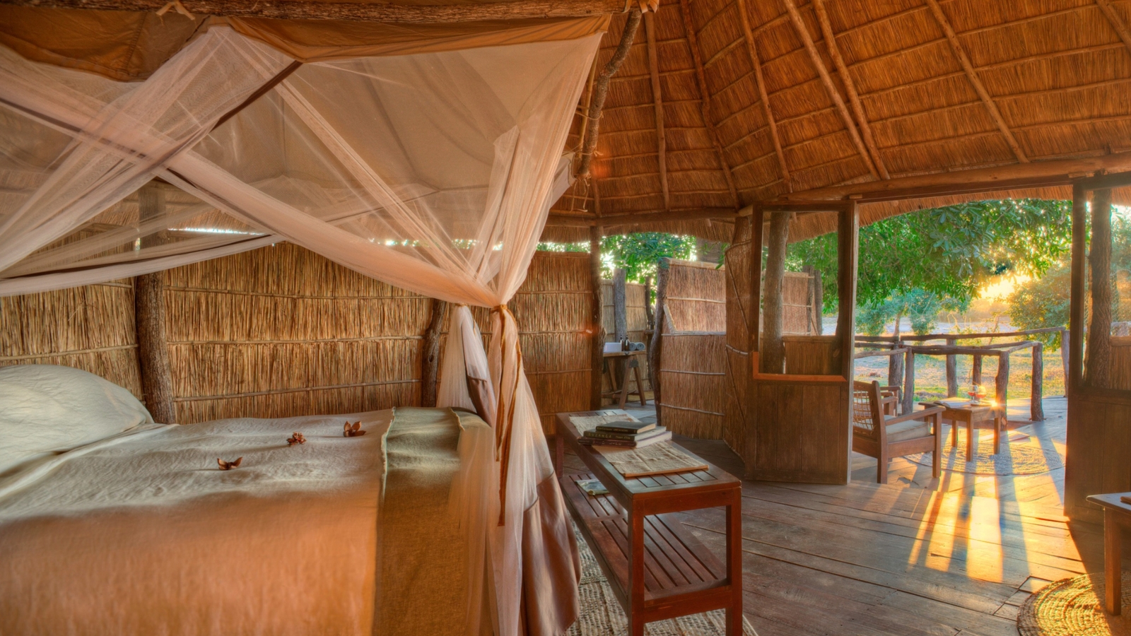 Four spacious chalets sit on raised wooden decks with grass and reed walls and large, open air en-suite bathrooms. Each chalet runs on solar power and is set under the shade of evergreen trees with private verandahs overlooking the surrounding bush and waterholes in the Luwi River.