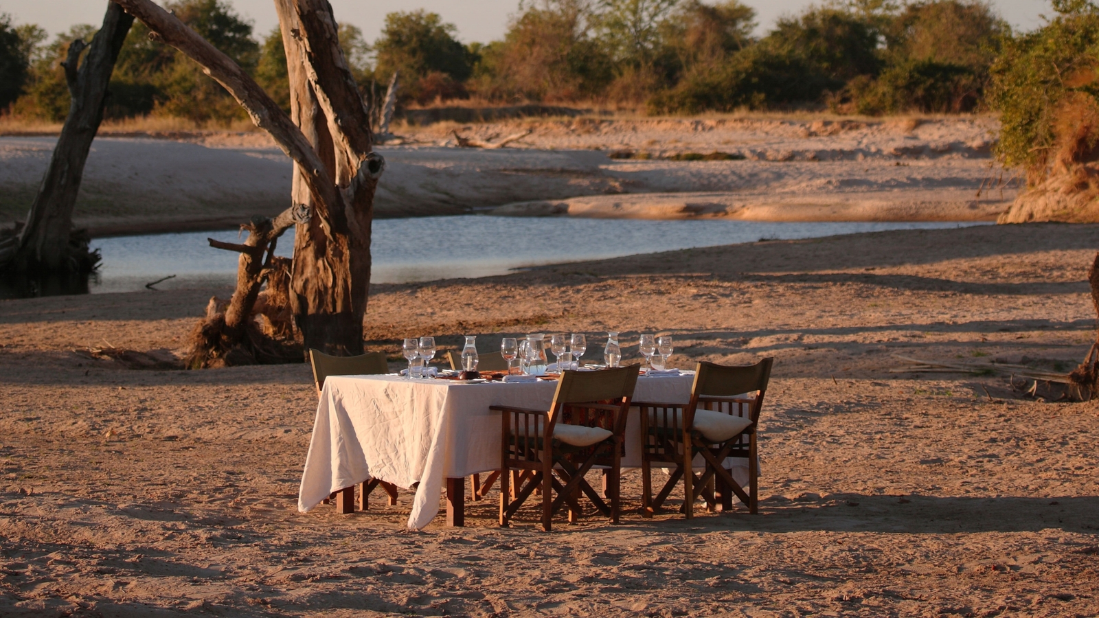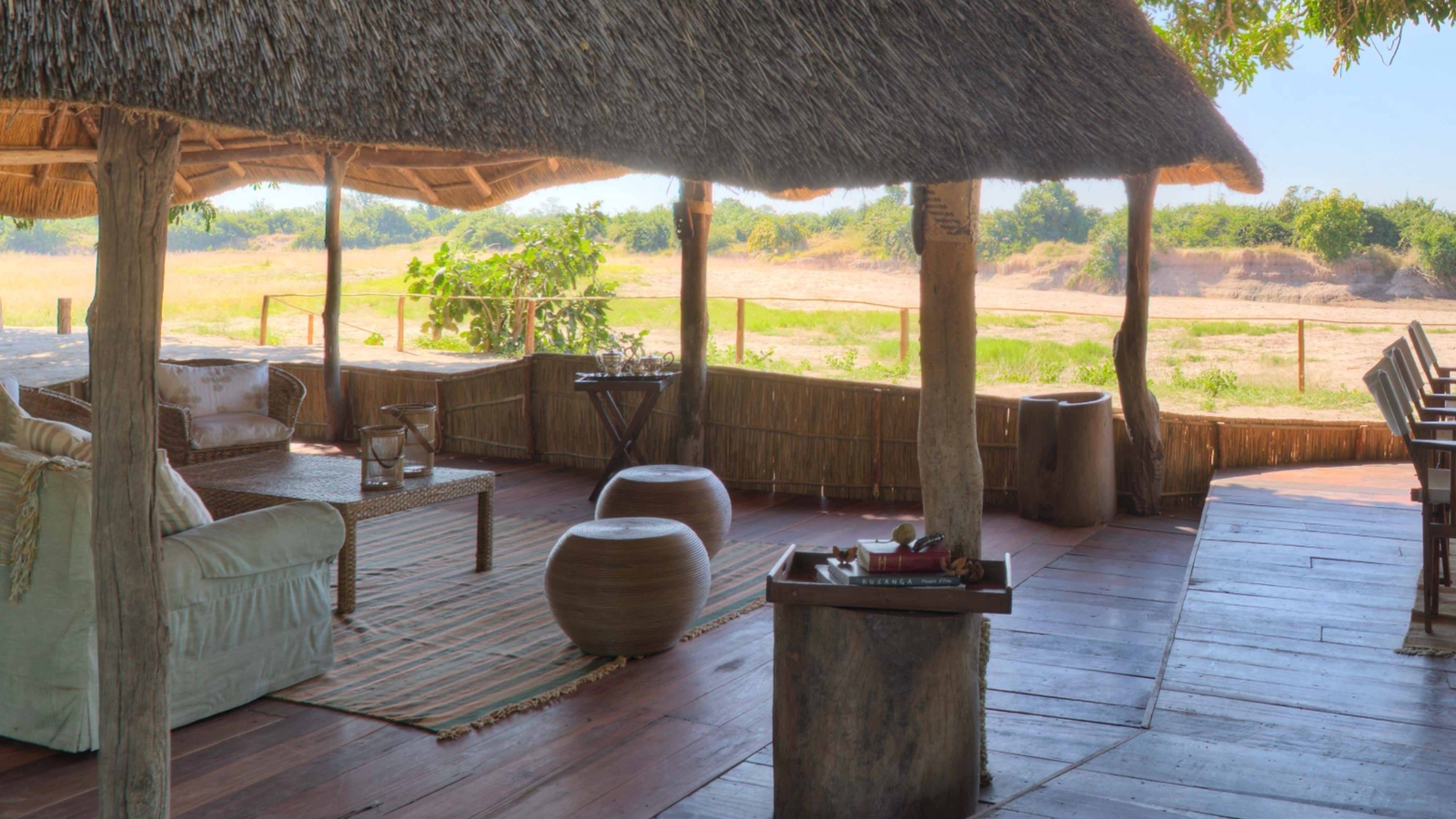 The open sided lounge is on the banks of the Luwi River with a bush bar and dining area offering a peaceful refuge where guests can study the camps collection of books or watch a variety of game visiting the permanent pools of water on the riverbed.