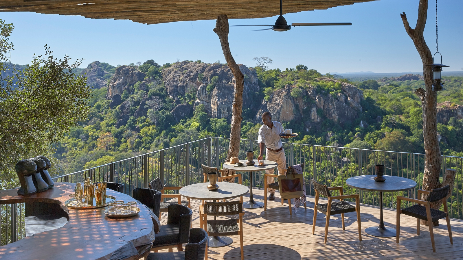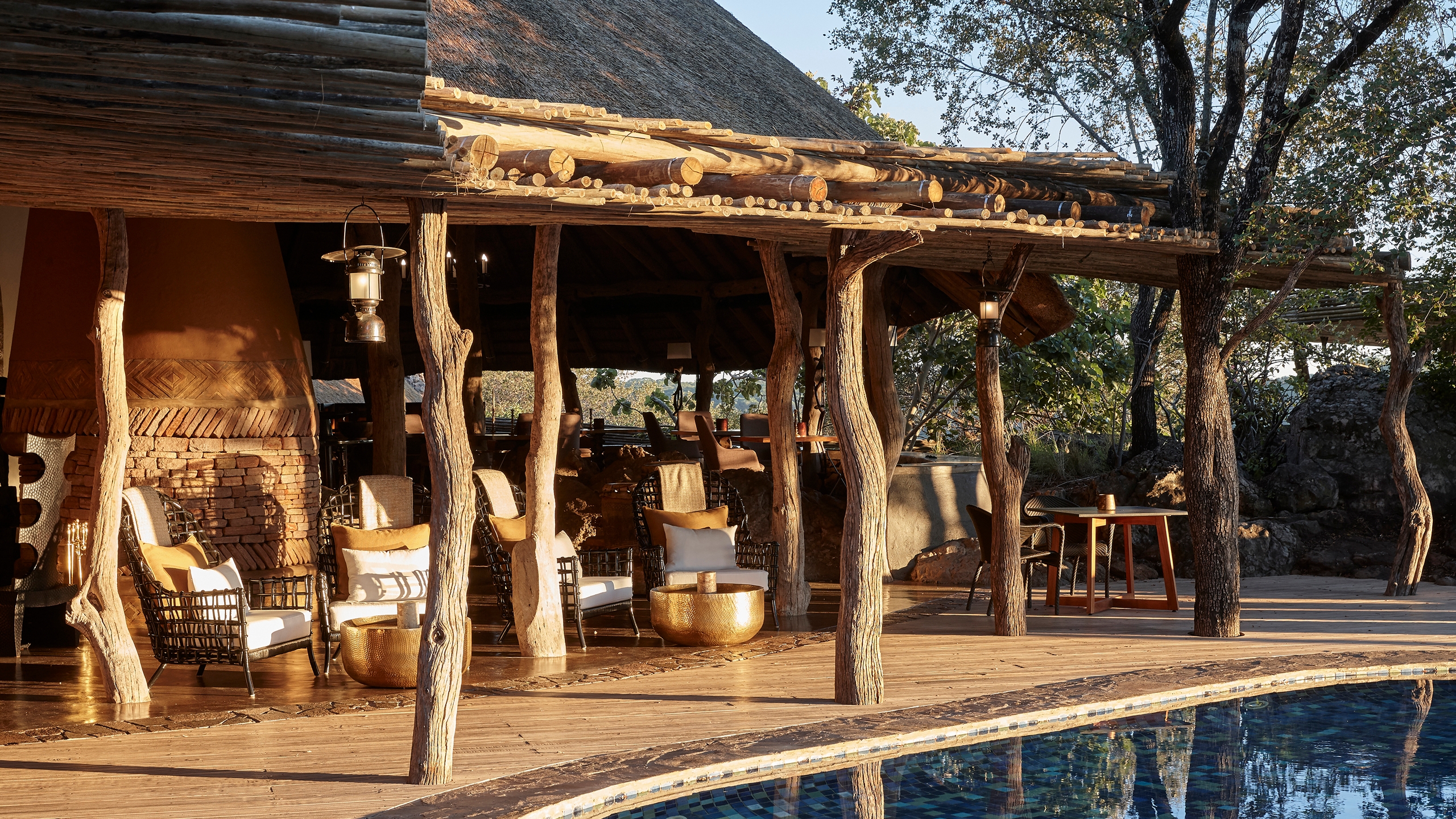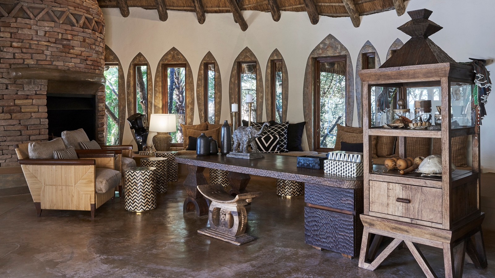 Thatch palapa-style buildings reach up through the trees and descend to heavily overhang its open-sided sitting rooms and dining areas for far-reaching views and the African essence of blending the outside with indoors. Loud ethnic patterns weaving themselves between soft earthy hues, inviting traditional furniture, local art and antiques decorate the lounges, spilling into the luxury suites of this lodge.