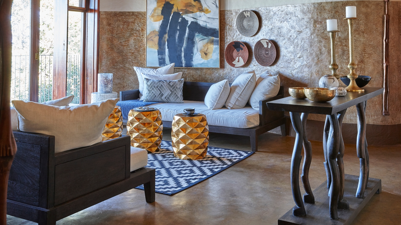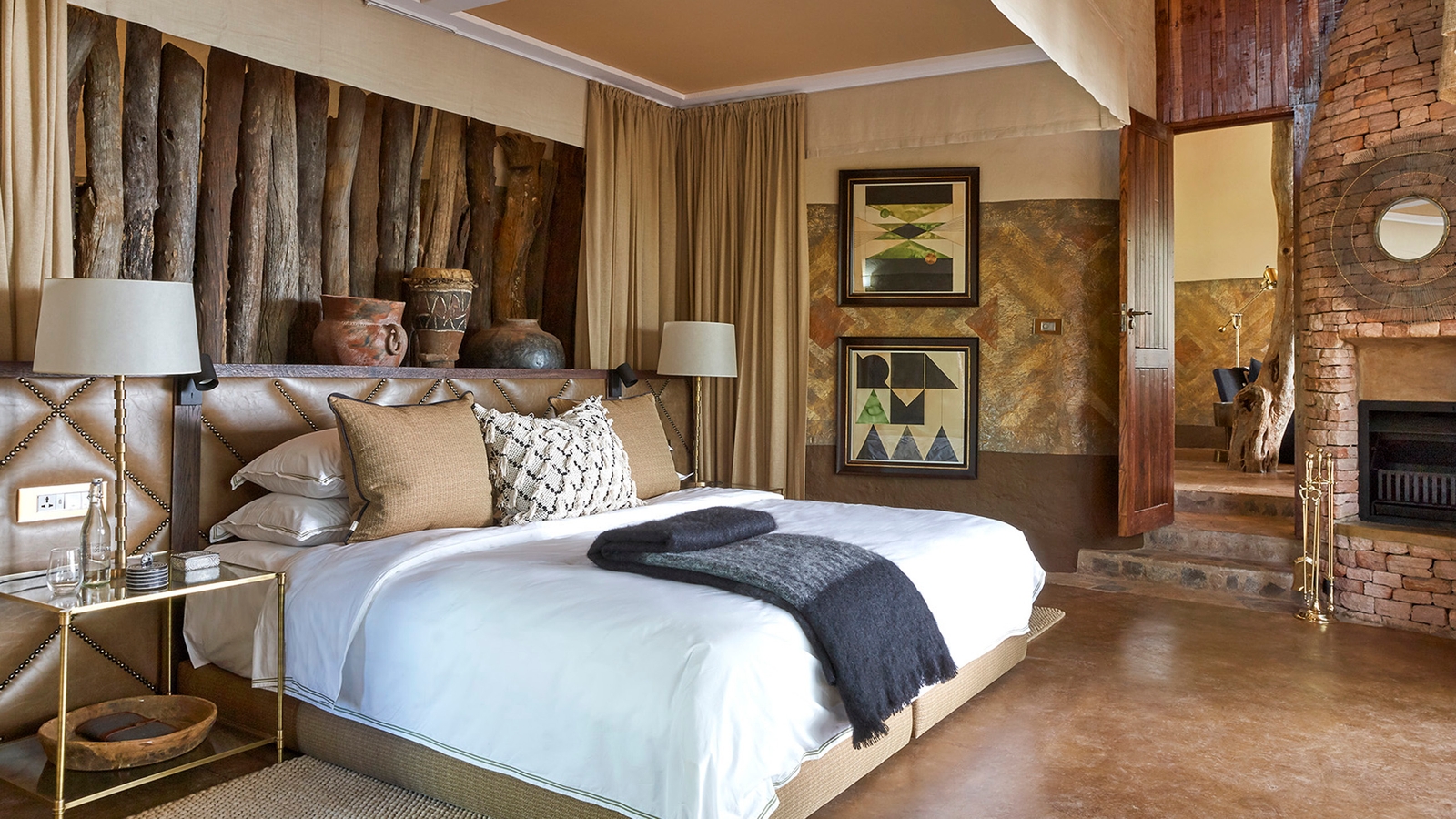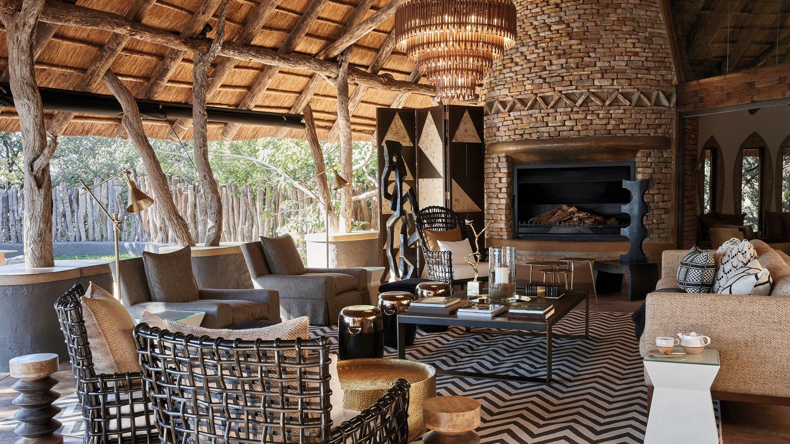 Thatch palapa-style buildings reach up through the trees and descend to heavily overhang its open-sided sitting rooms and dining areas for far-reaching views and the African essence of blending the outside with indoors. Loud ethnic patterns weaving themselves between soft earthy hues, inviting traditional furniture, local art and antiques decorate the lounges, spilling into the luxury suites of this lodge.